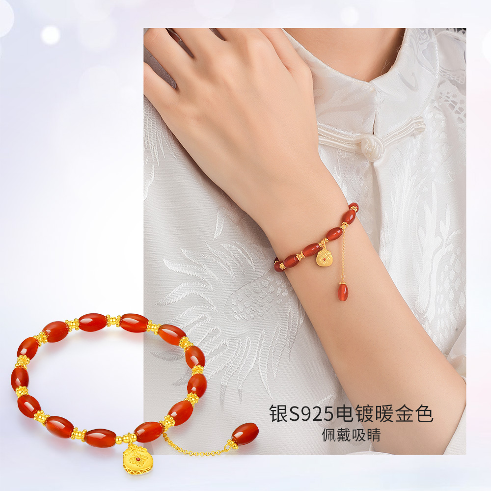 周大生福包吊坠手串女送女友红玛瑙纯银手链小众国风生日礼物