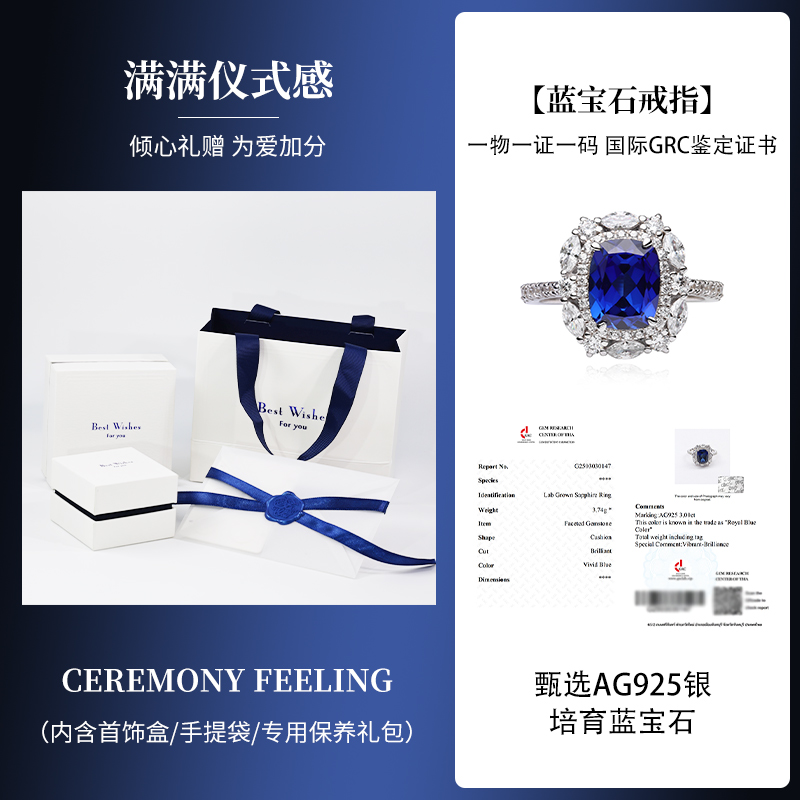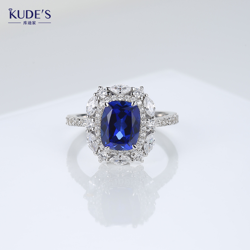KUDE'S库迪家3克拉培育蓝宝石戴妃款戒指女高级感方枕形S925纯银