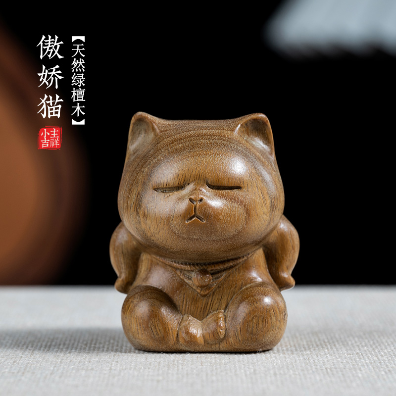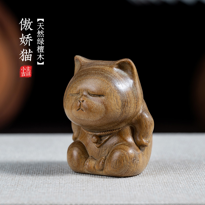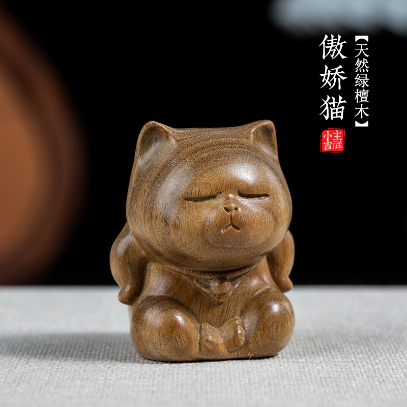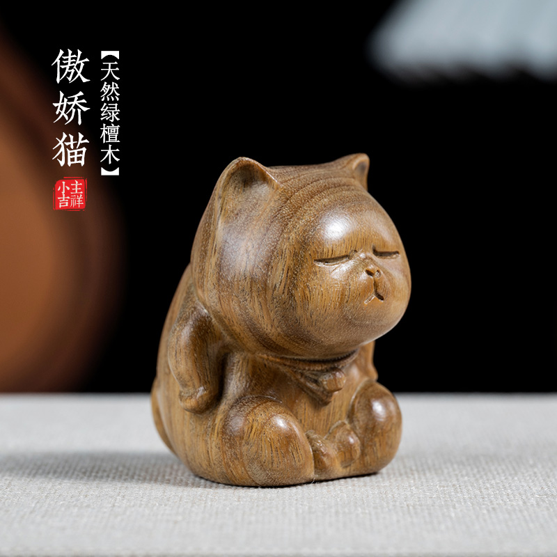 天然绿檀木傲娇猫咪可爱木雕文玩手把件创意桌面装饰品不生气送礼