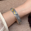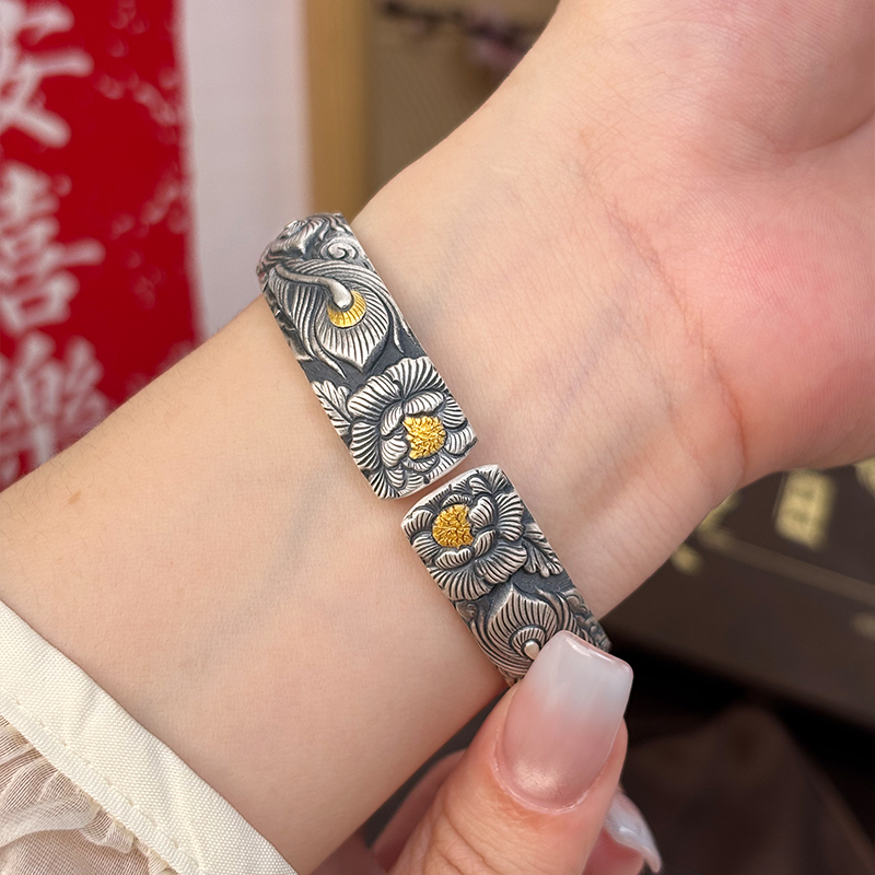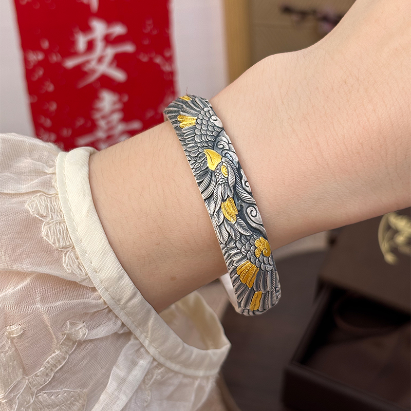 航达银匠 凤凰牡丹足银999银手镯实心开口手工镶金传承银镯妈妈款
