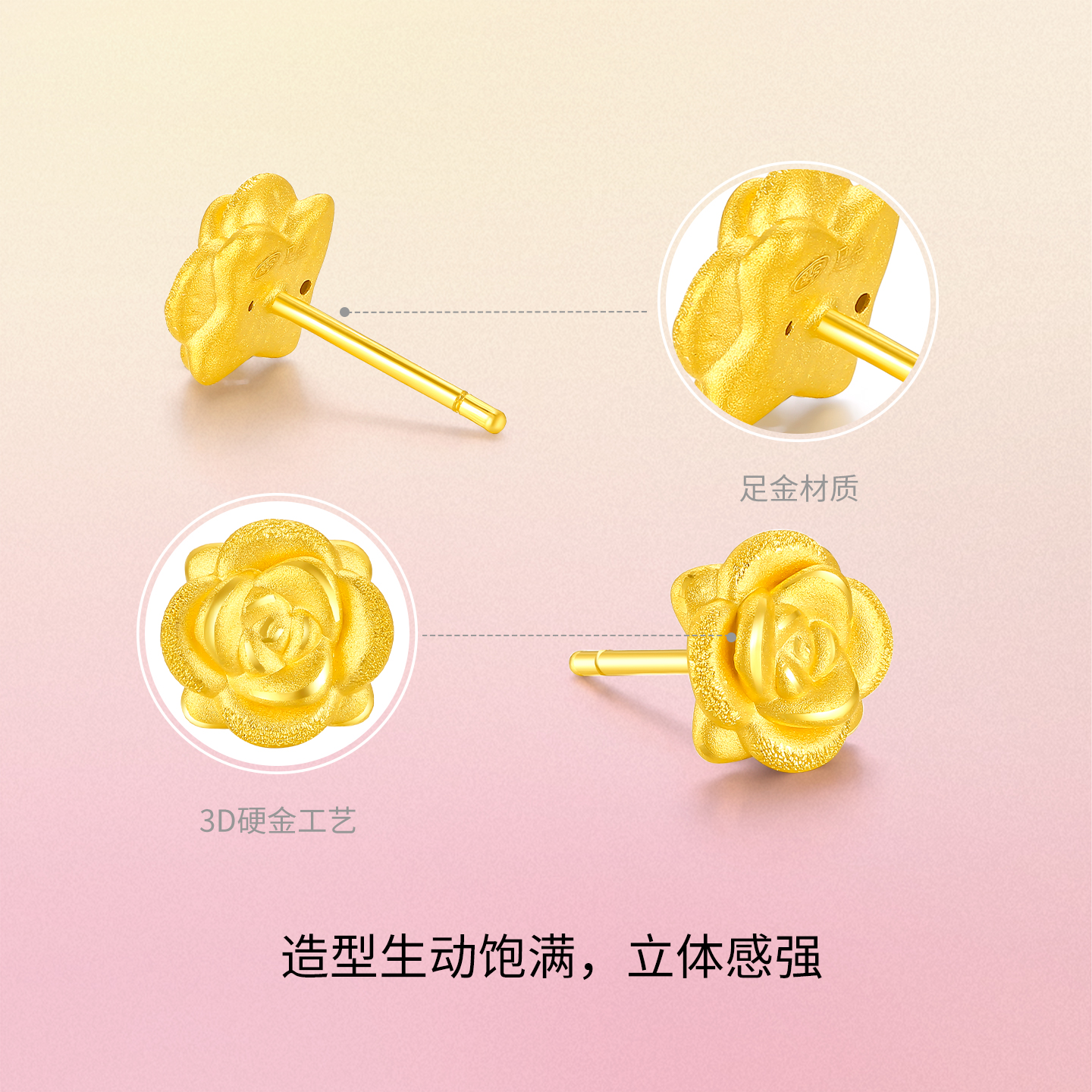 周六福黄金耳钉女玫瑰花耳饰耳坠耳环足金定价3d硬金礼物旗舰店