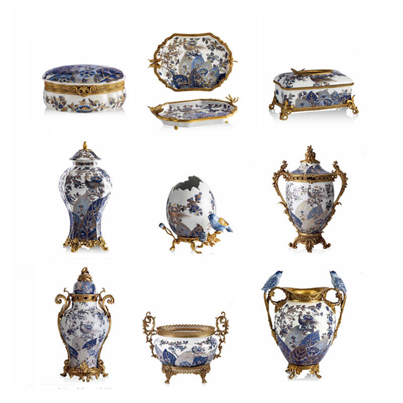 奢华高端档蓝色法兰釉青花铜花瓶托盘果盘欧式客厅玄关罐装饰摆件