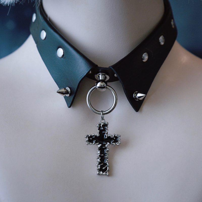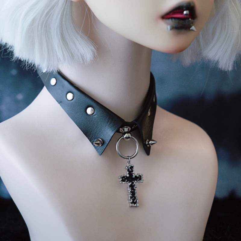 怪糖饰物集原创手工融化十字假领式仿皮颈链choker暗黑亚文化黑色