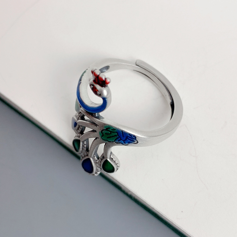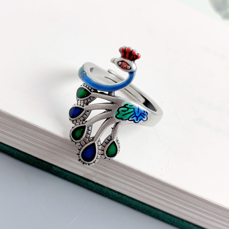 新款彩色孔雀戒指女活口烧蓝工艺凤凰设计指环动物