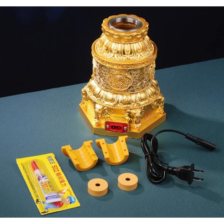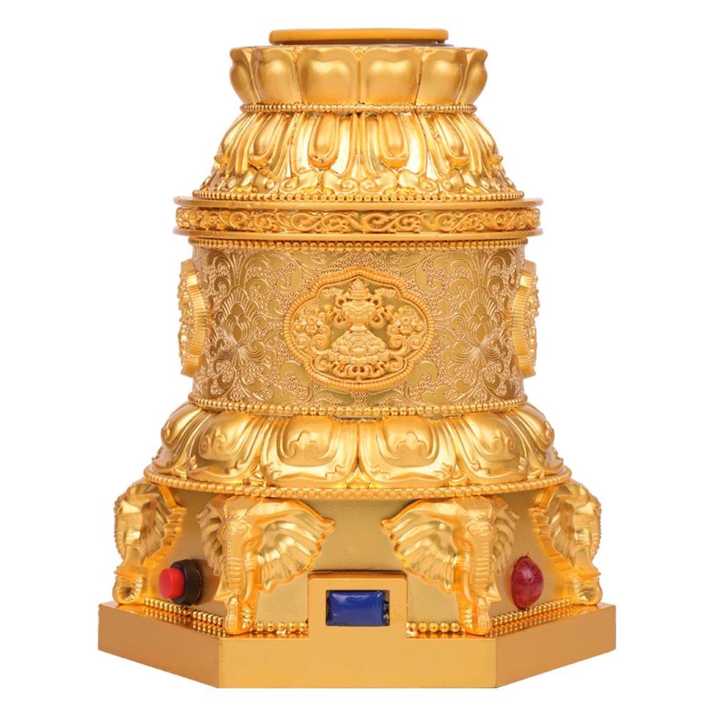 当前位置:首页>商品详情>八吉祥藏式工艺品雕花电动手摇底座转轮桶合金桌面民族风装饰摆件
