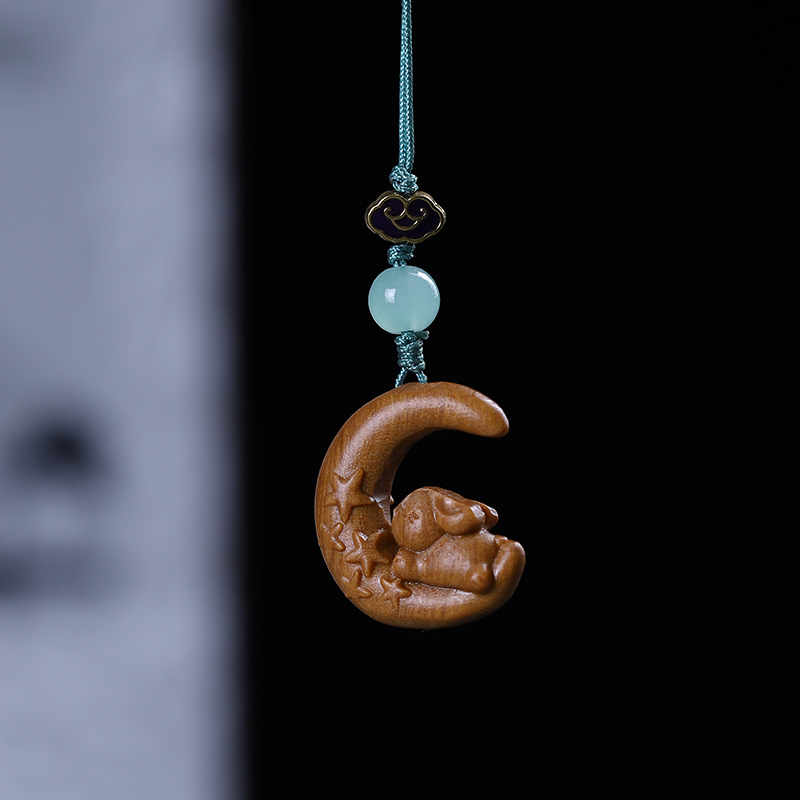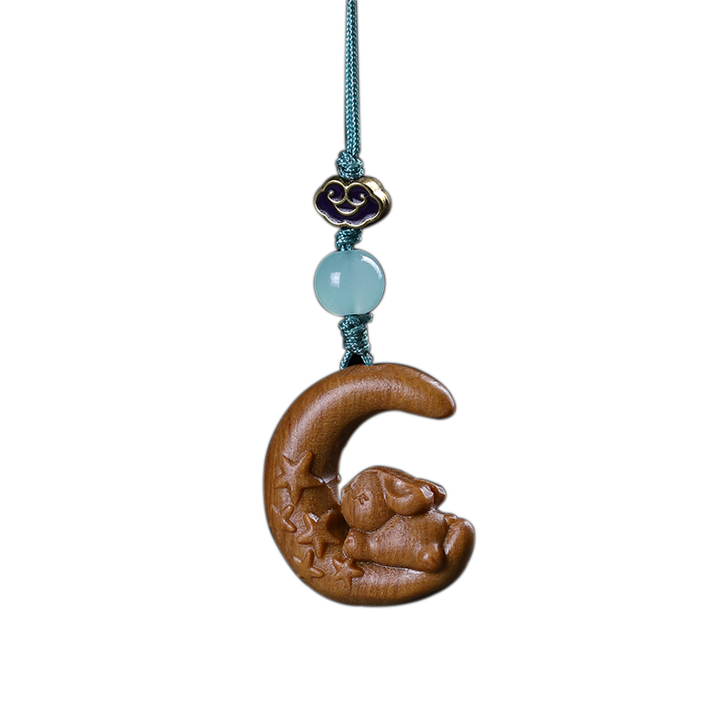檀木DIY创意雕刻可爱月亮趴趴兔女车钥匙扣背包手机挂件随身配饰