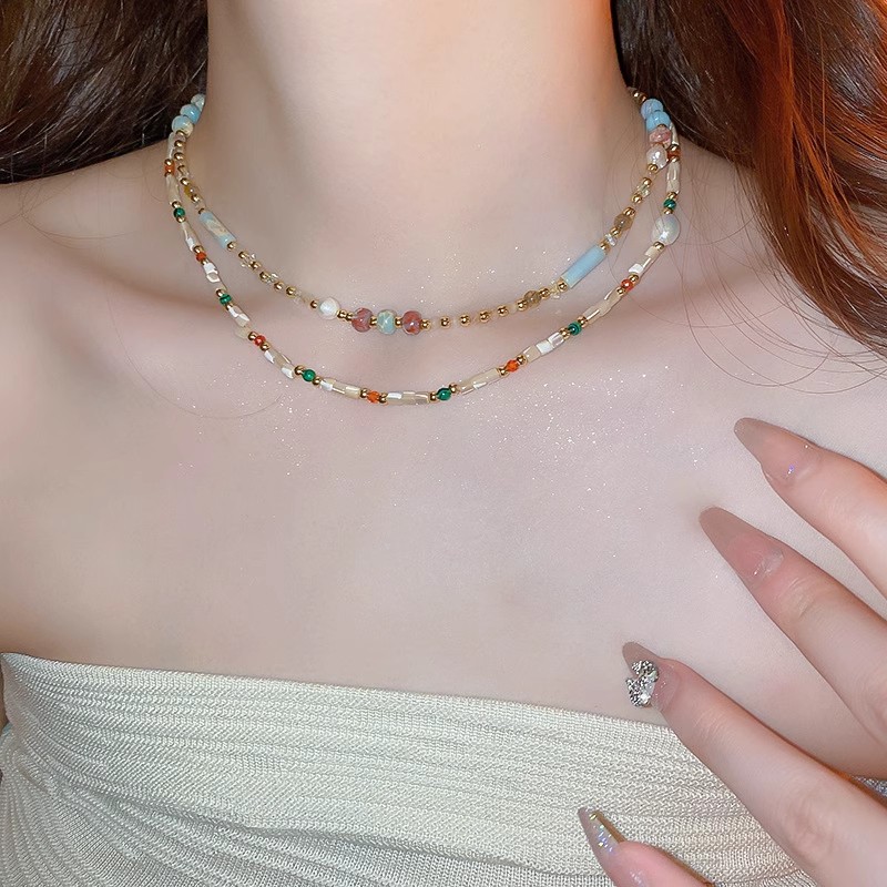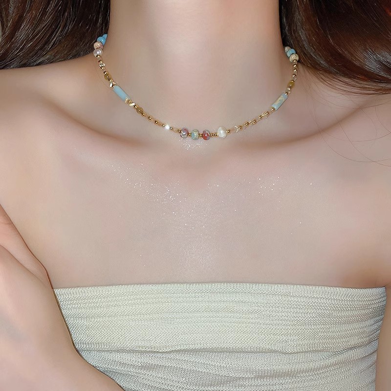 民族风彩色琉璃米珠串珠项链锁骨链女2024新款新中式复古小众配饰