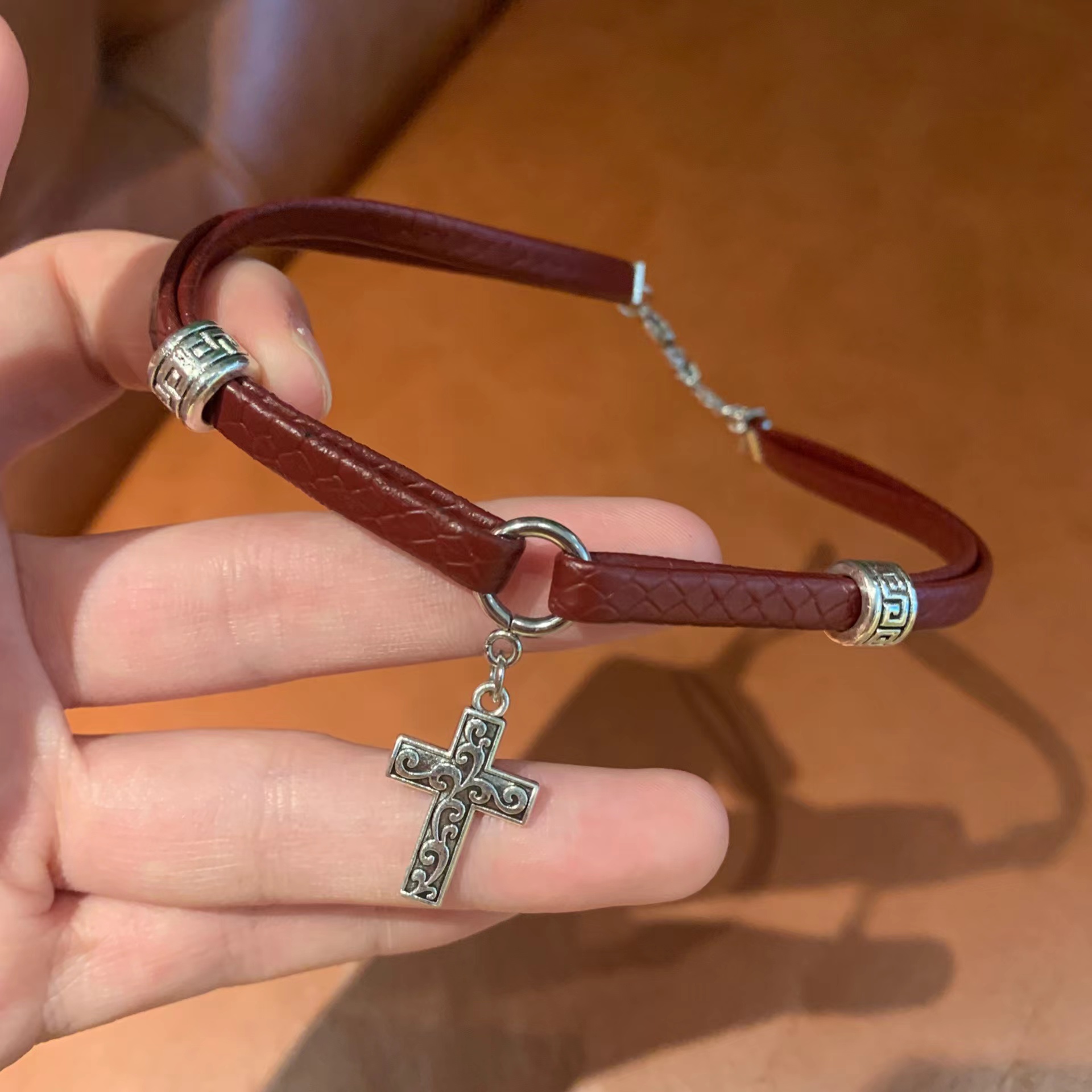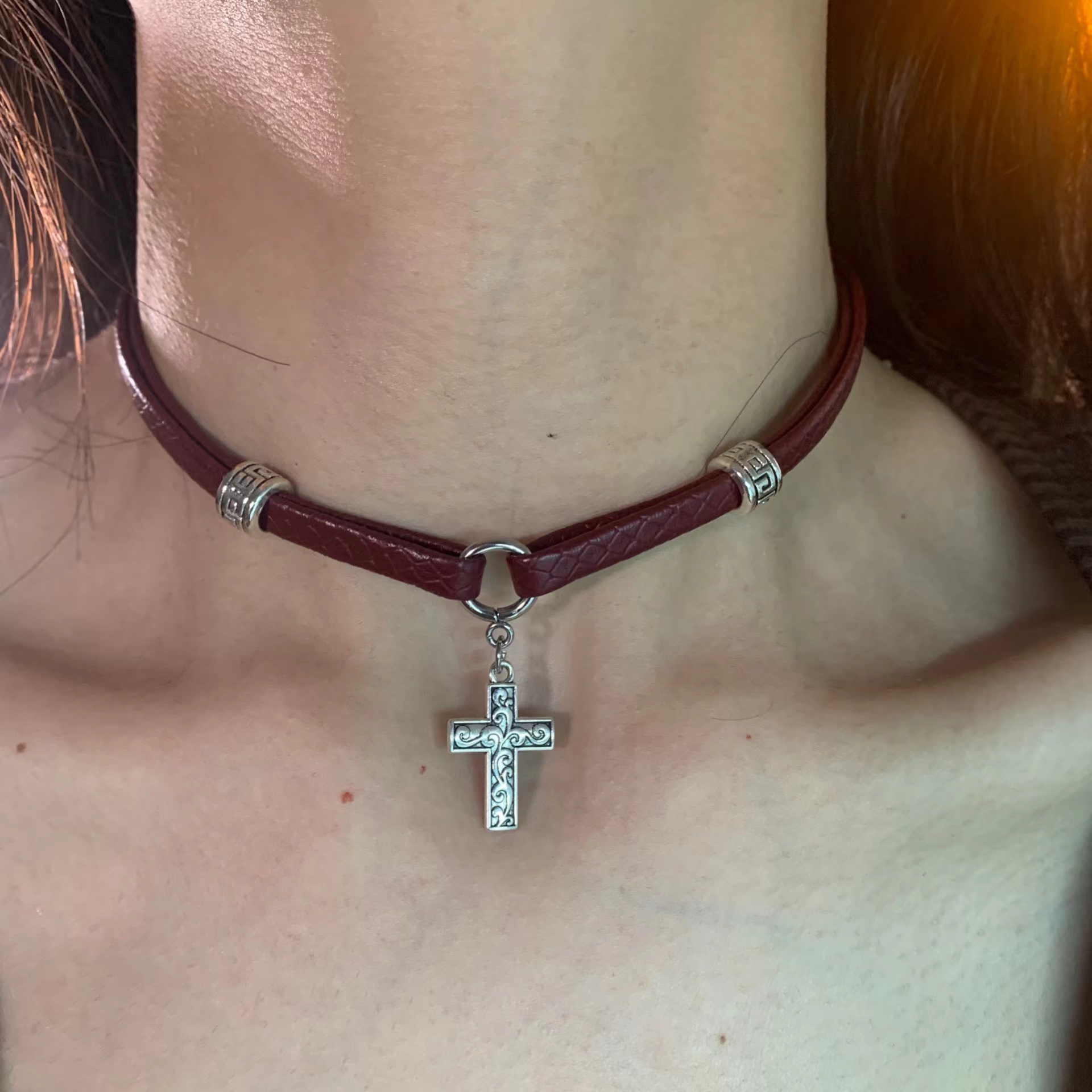 棠洛 暗红色皮革十字架choker女甜酷辣妹风锁骨链小众项圈日常潮