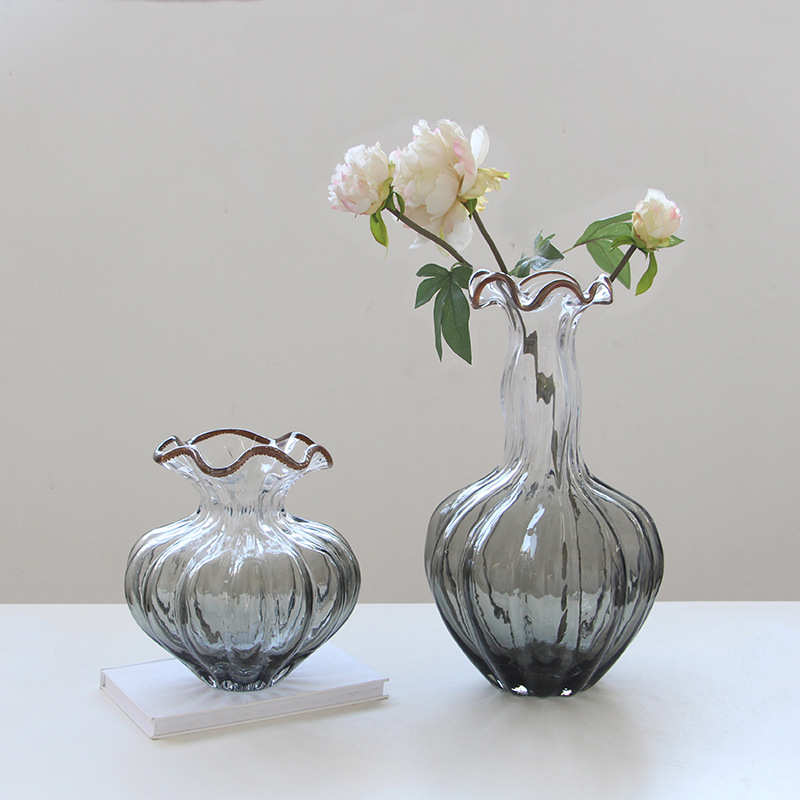 北欧手工波浪口花边透明灰歪脖大肚子南瓜花瓶样板间客厅装饰花瓶