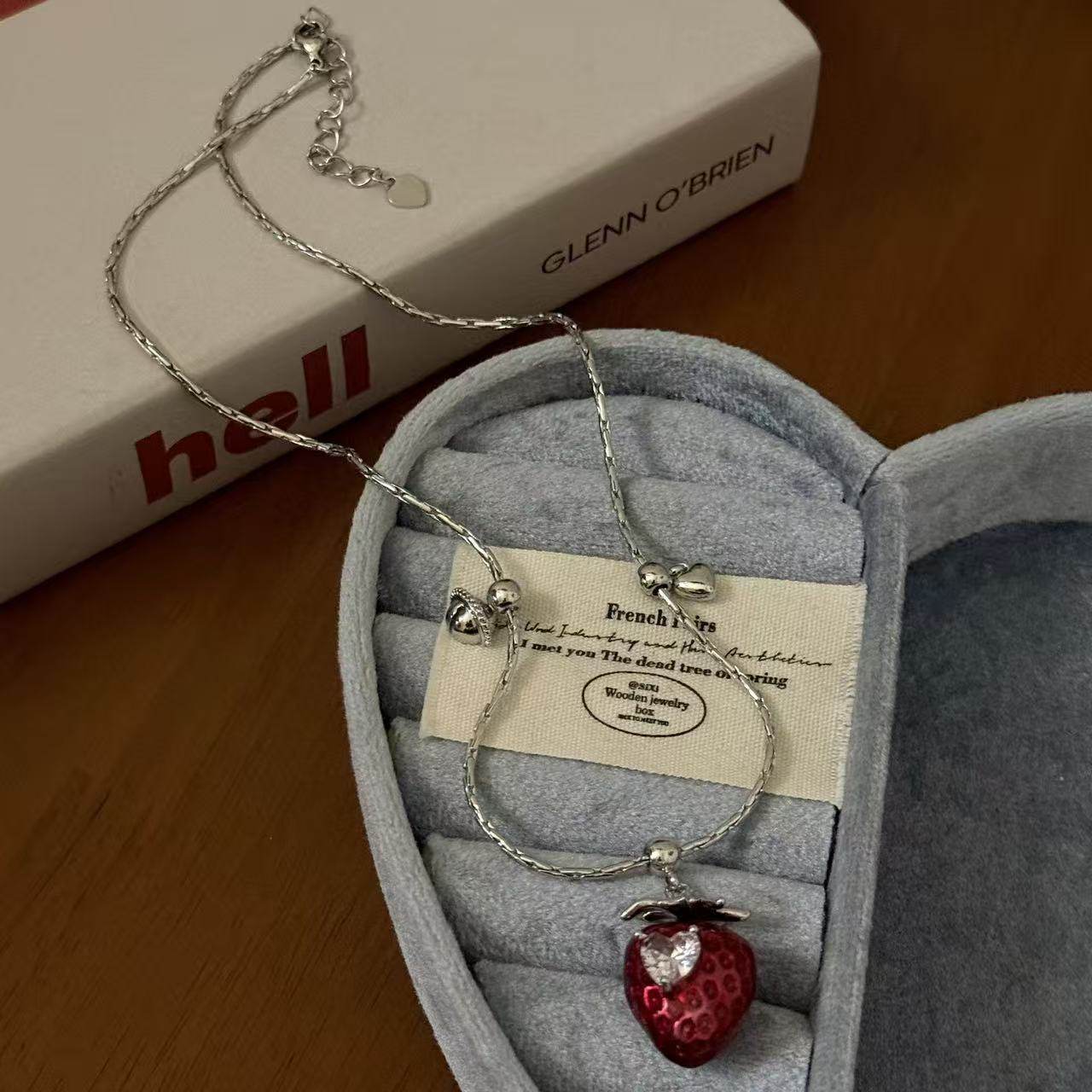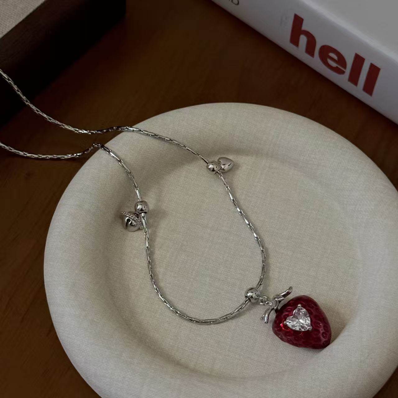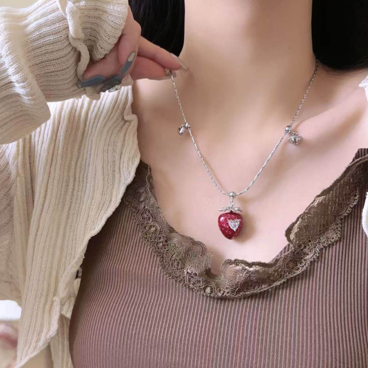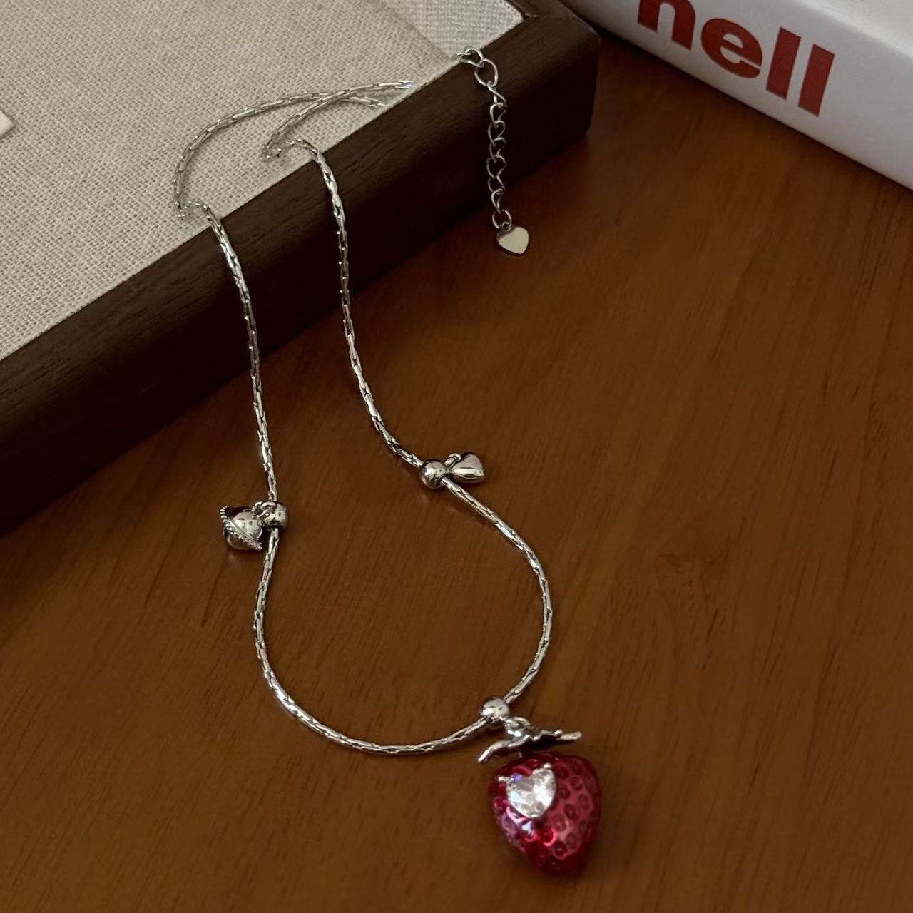 红色草莓爱心锆石吊坠项链女小众甜美少女秋冬百搭锁骨链毛衣链