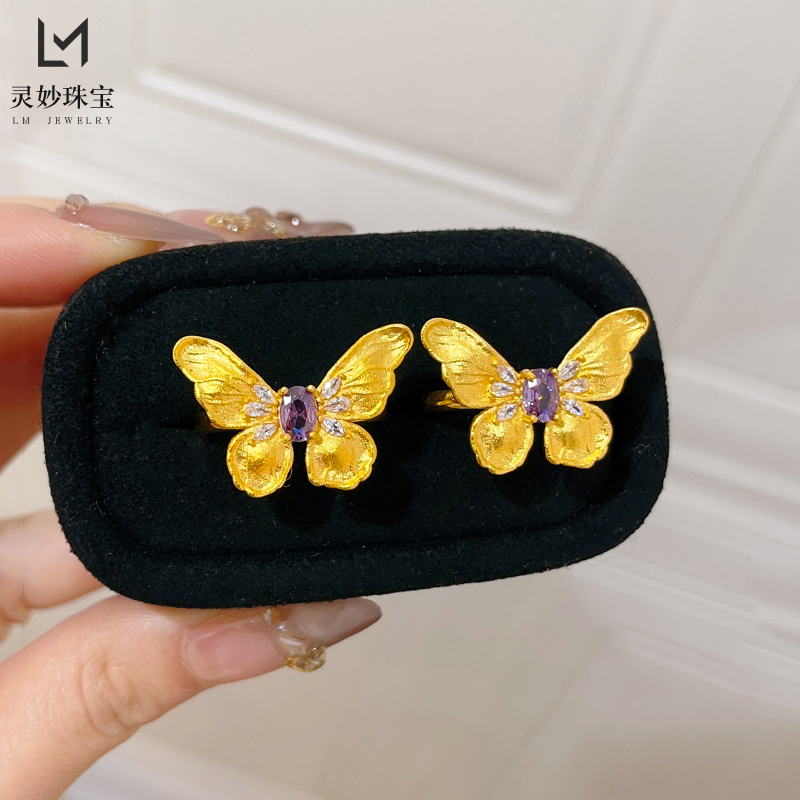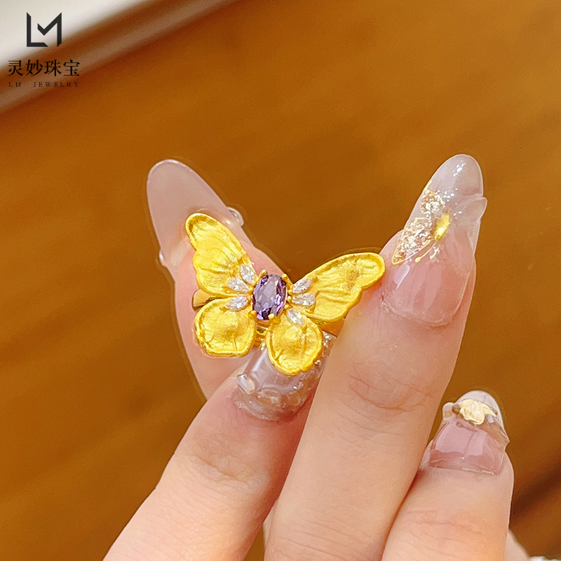 古法沙金999点钻拉丝梦幻紫色蝴蝶戒指立体福蝶指环仙气女送礼物