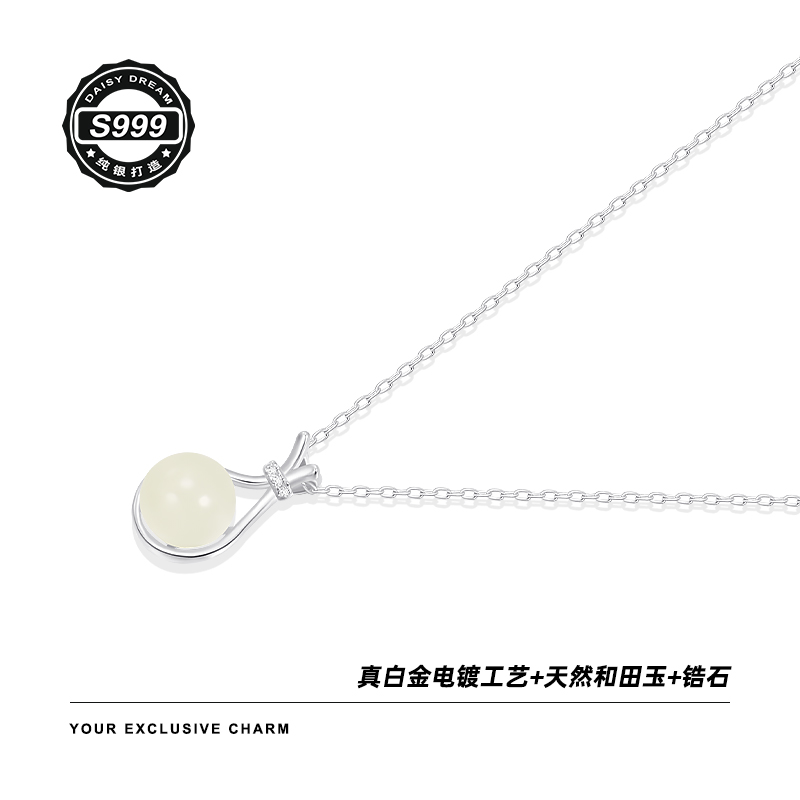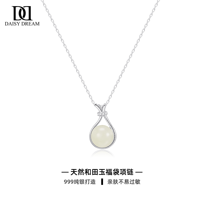 S999银福袋吊坠项链女款轻奢小众天然和田玉锁骨链颈链送女友礼物