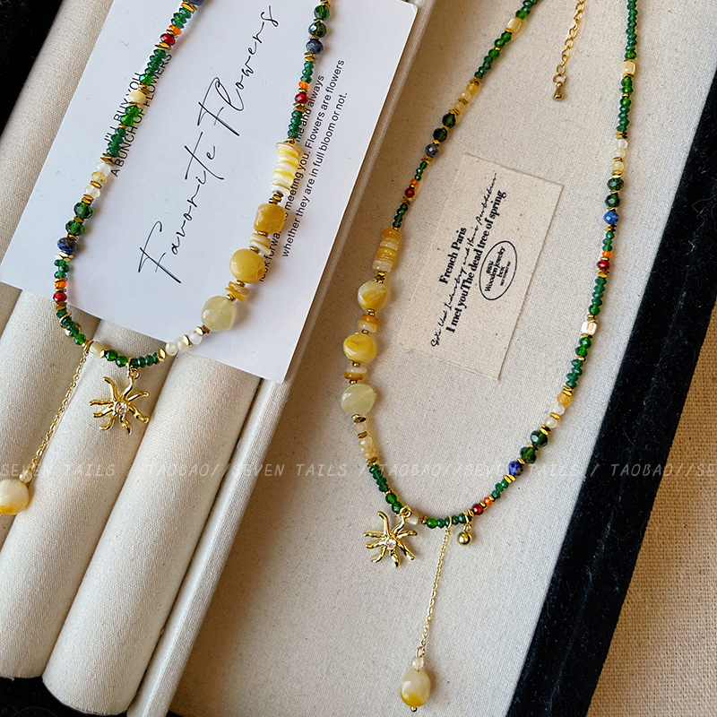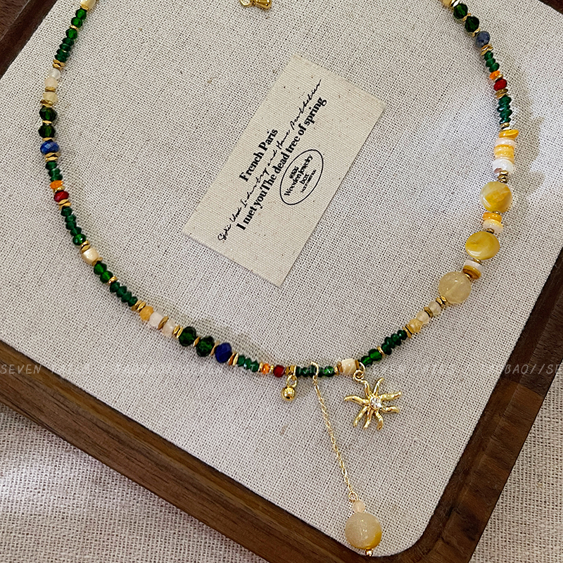 波西米亚太阳花吊坠流苏项链女高级感水晶串珠锁骨链复古轻奢颈链