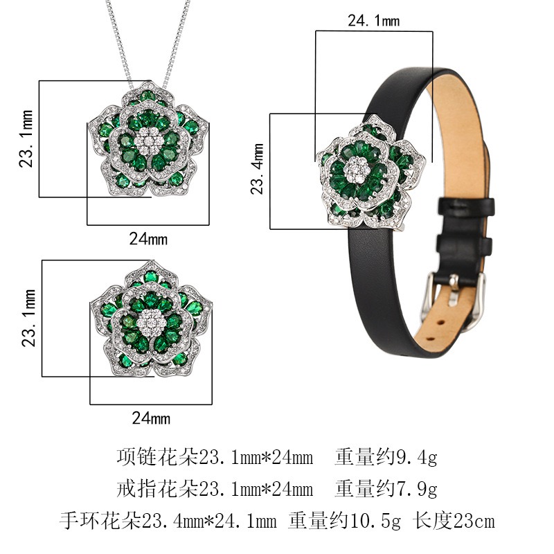 新款铜镀银仿彩宝绿色镶钻花朵吊坠女款项链满钻开口戒指仿皮手环