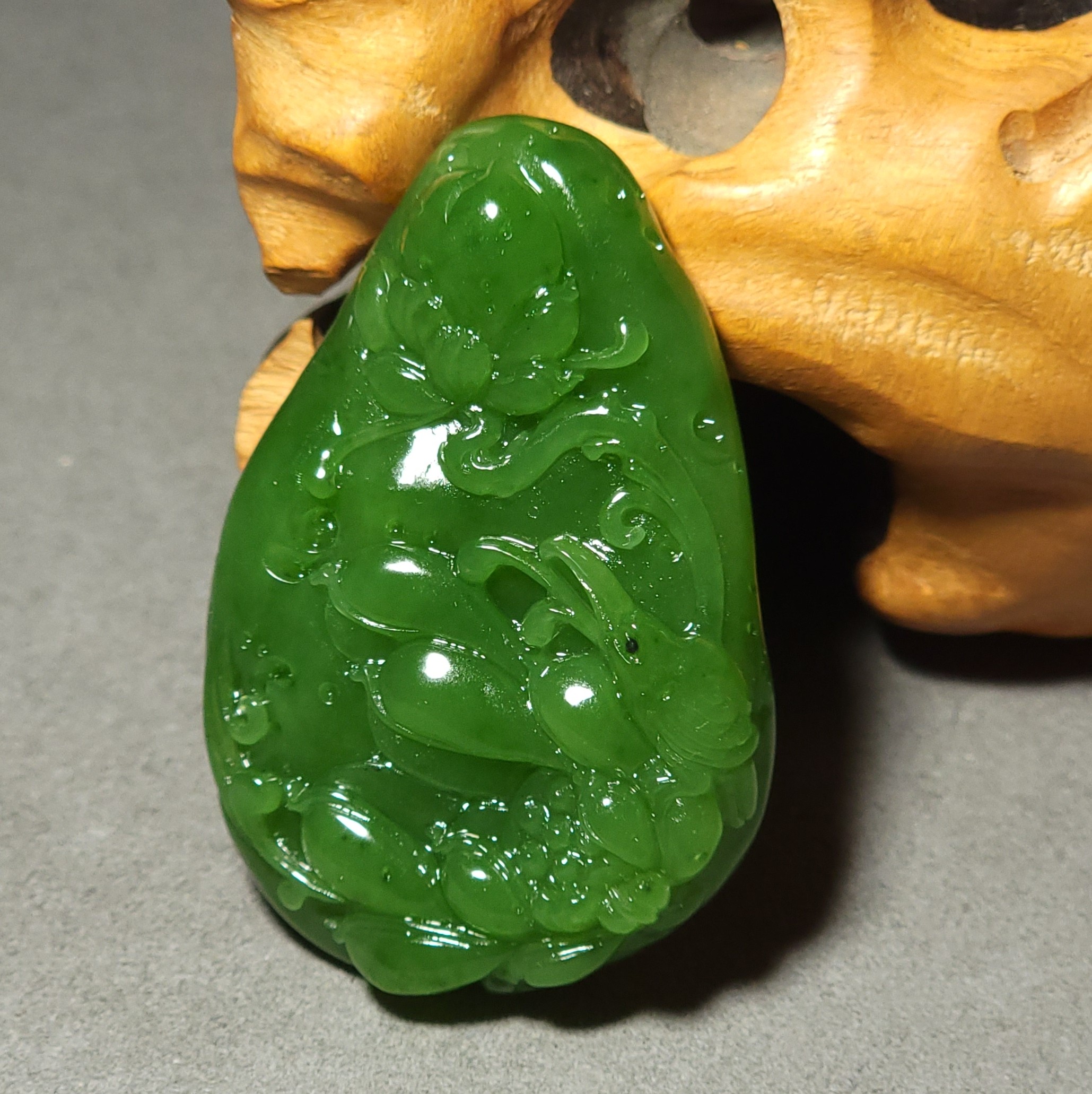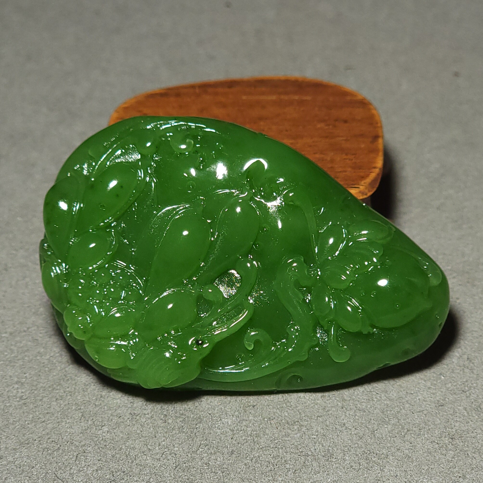 新疆的猫L122002 44.6克,高色调浓艳的苹果绿碧玉喜事连连雕件