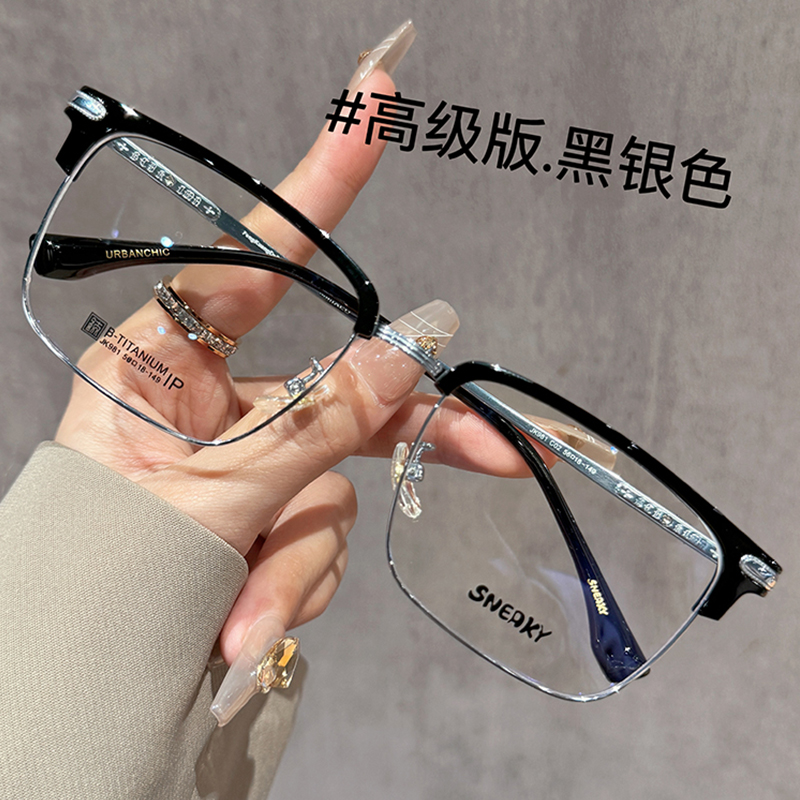 纯钛黑框半框眼镜男款大框近视眼镜框方框可配度数斯文眼睛镜框女
