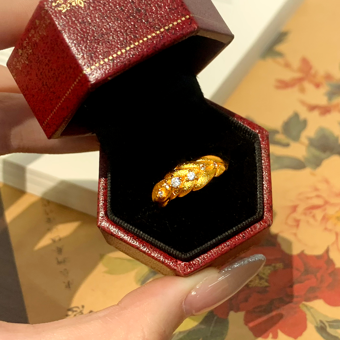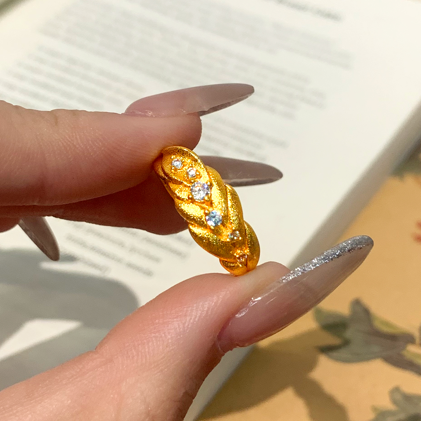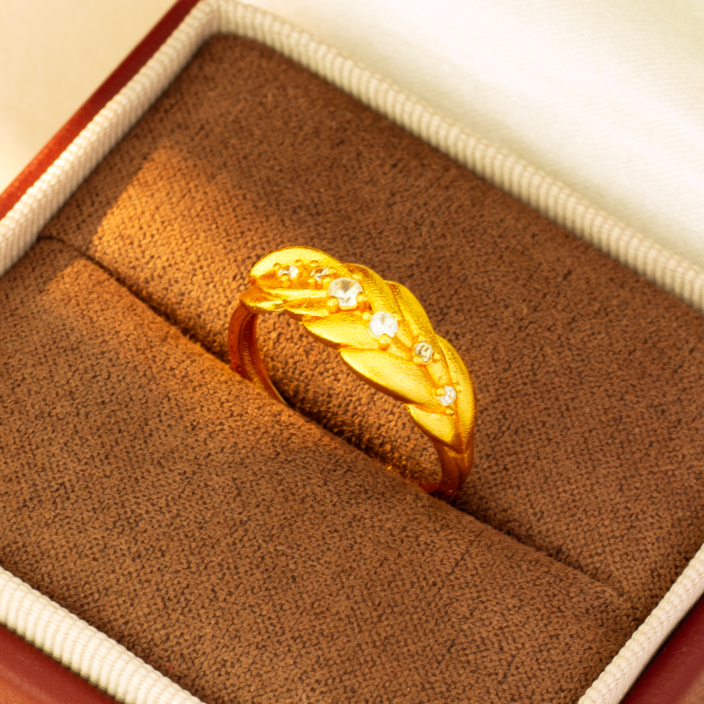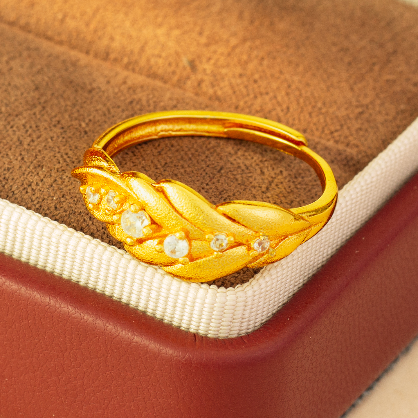 2025新品仿金色拉丝镶钻叶片戒指女款小巧轻奢开口调节麦穗指环