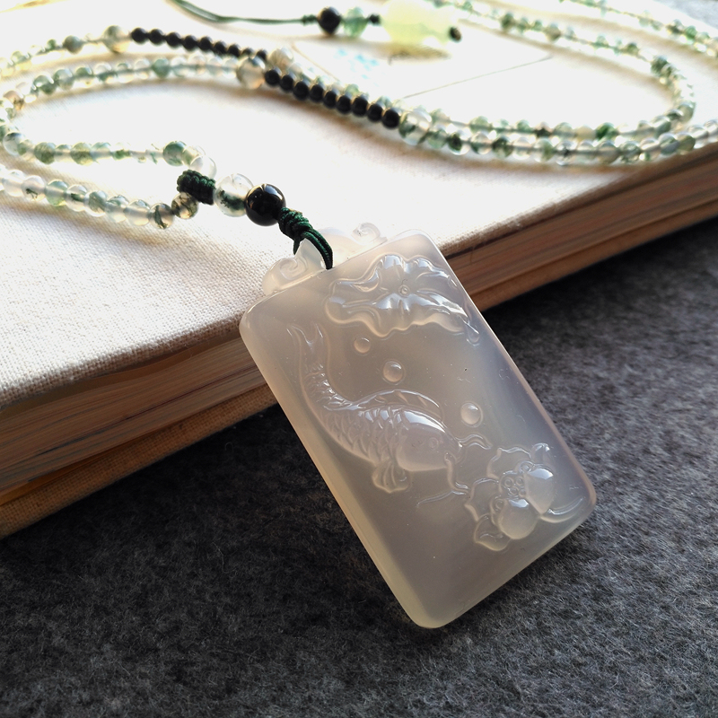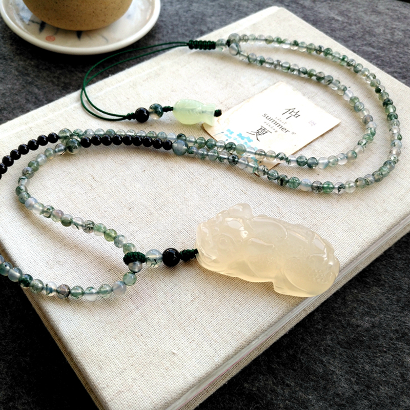 原创设计天然白玉髓玉兰花毛衣链水草玛瑙项链玉石吊坠挂件情侣款