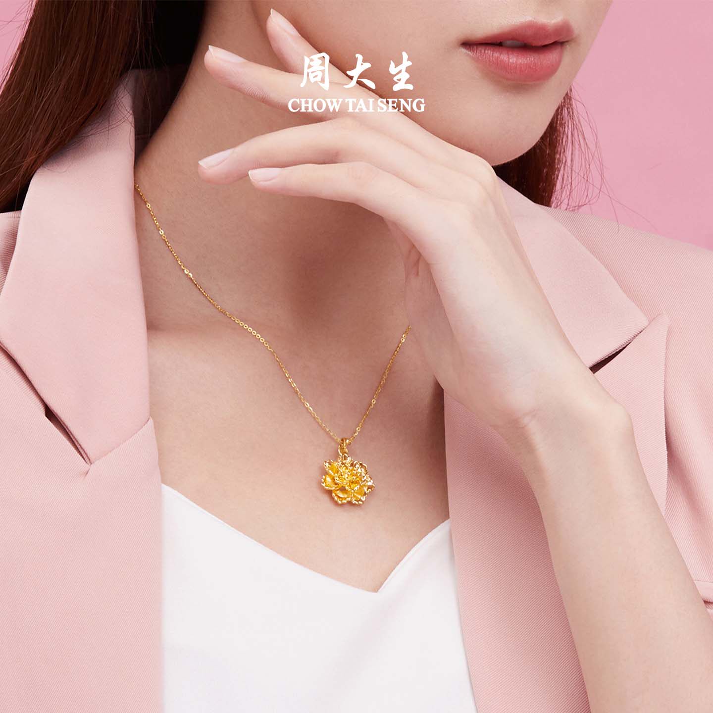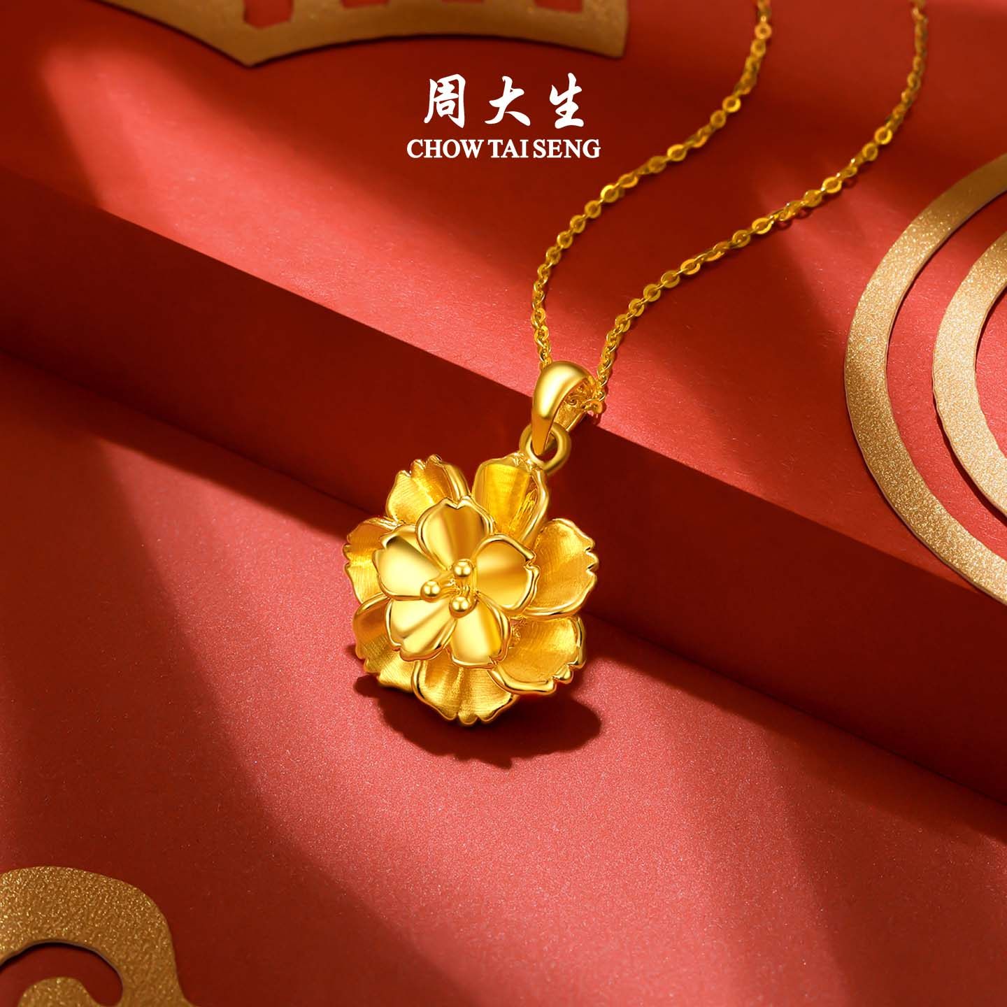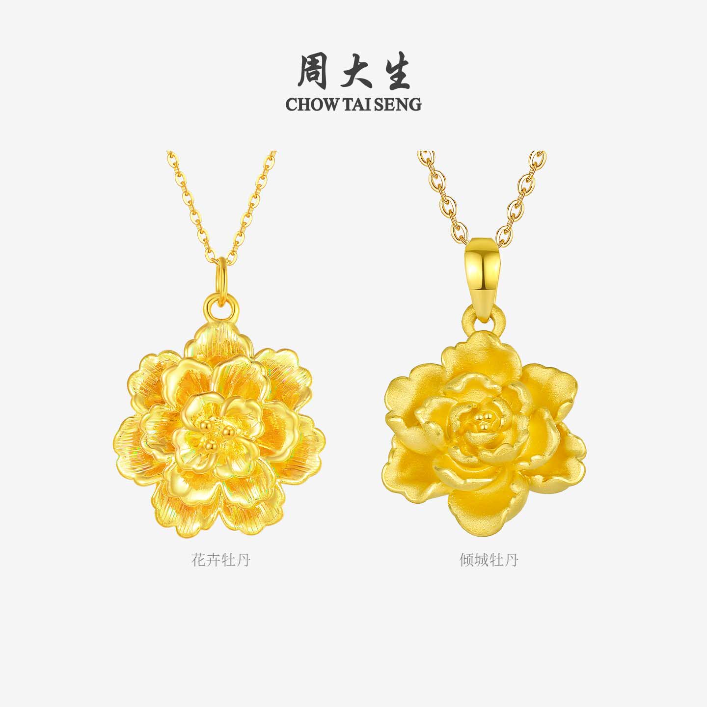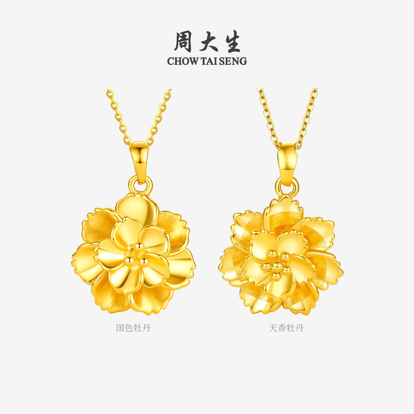 周大生黄金牡丹花吊坠女足金硬金大金花项链挂坠圣诞礼物送女朋友
