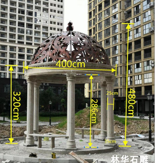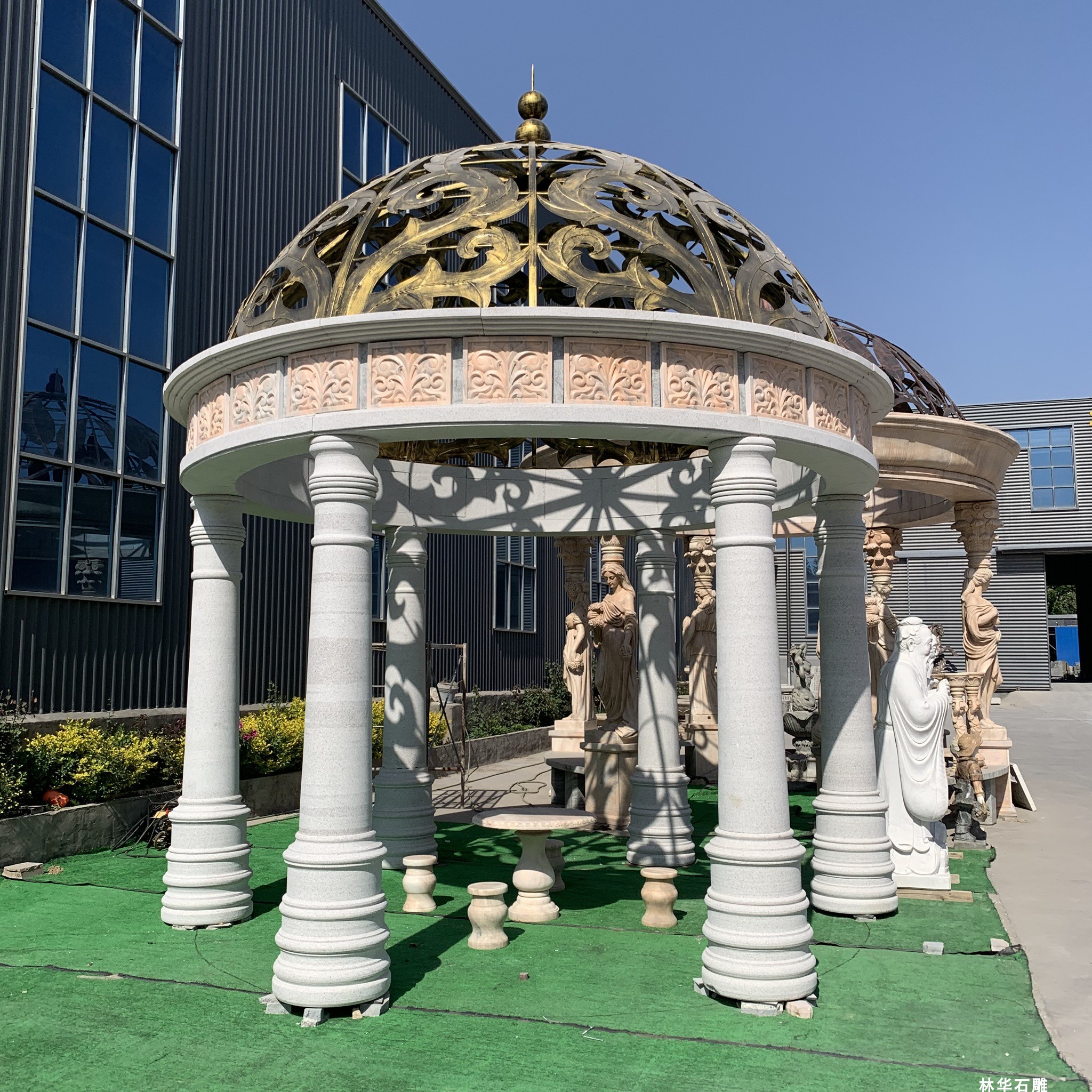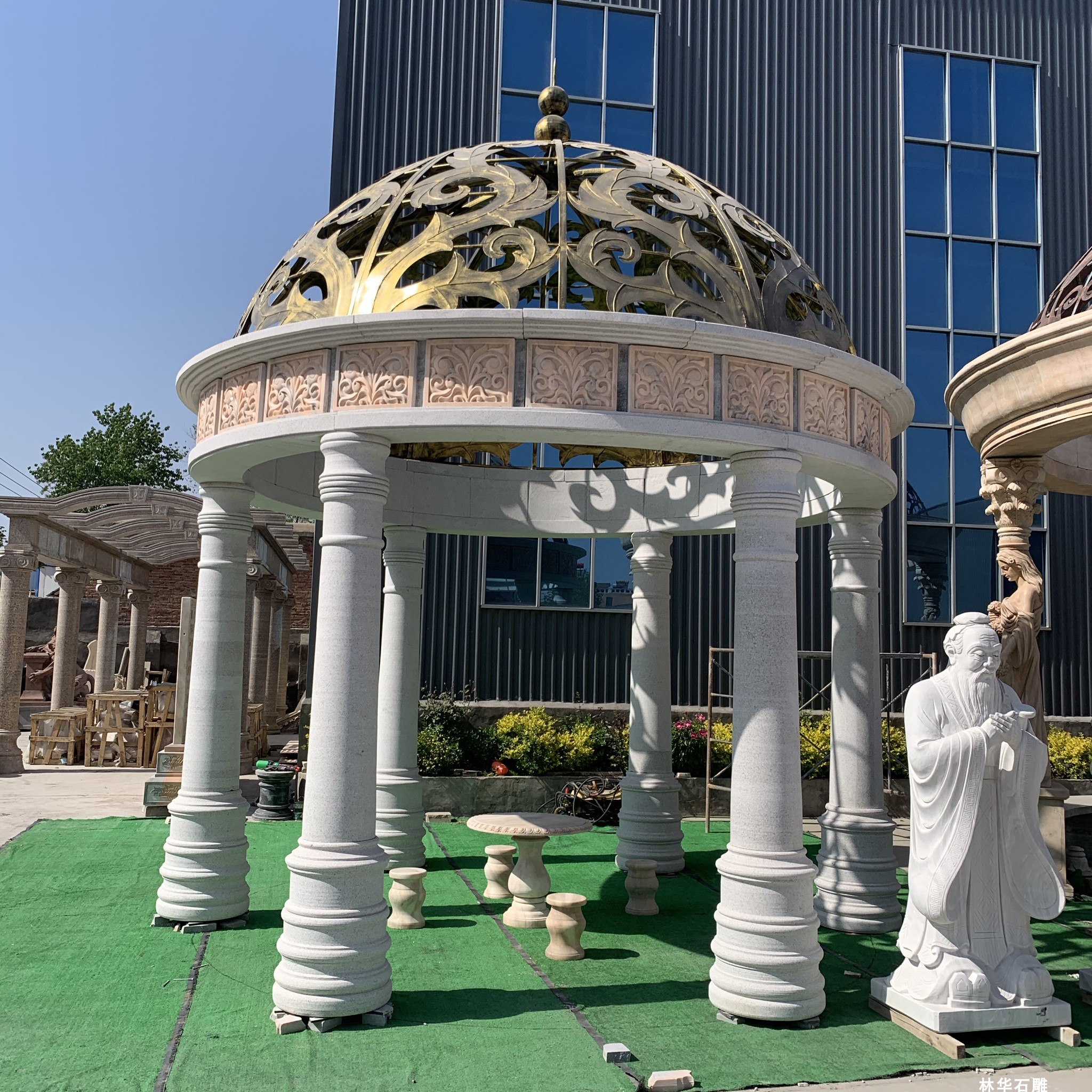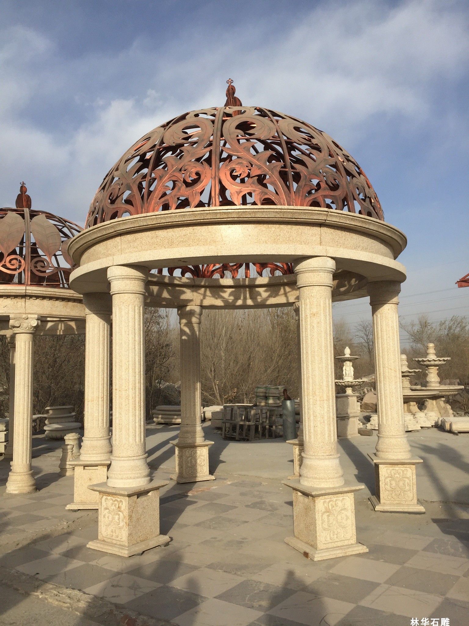 石雕欧式凉亭 户外大理石庭院铁艺帽穹顶亭子 黄锈石亭子厂家定制