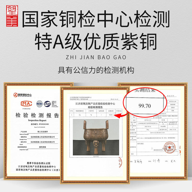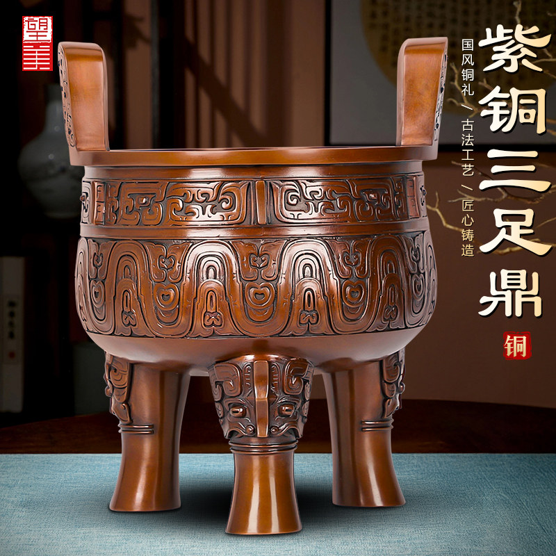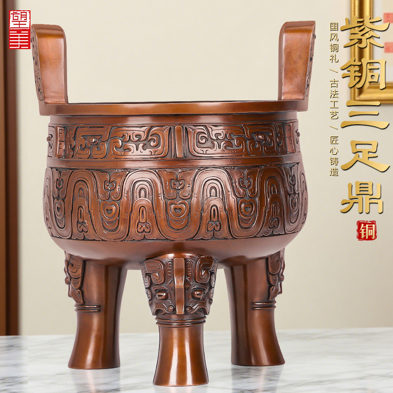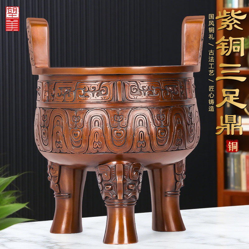 纯紫铜三足鼎摆件公司庆典大号落地圆鼎香炉鼎盛千秋铜鼎工艺品