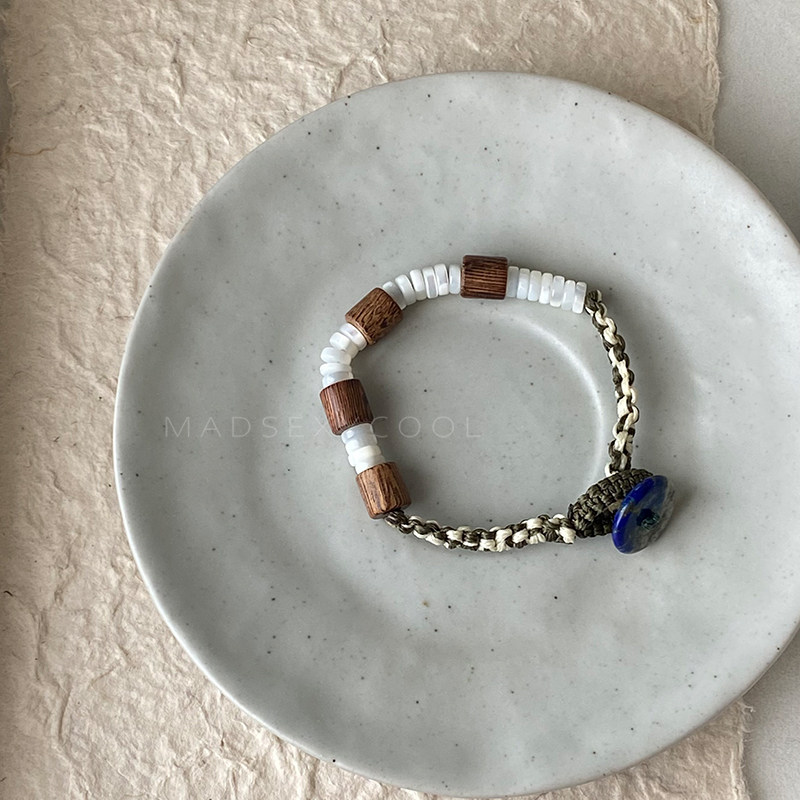 木调手工编织手串手链女小众复古手绳白贝青晶石民族风手饰时尚