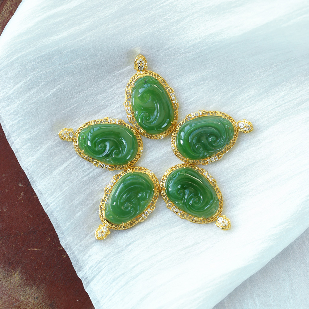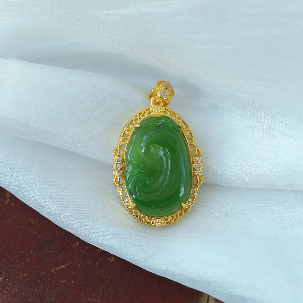 天然俄罗斯碧玉冰绿如意纯银镶嵌吊坠 女款玉石挂坠饰品礼物