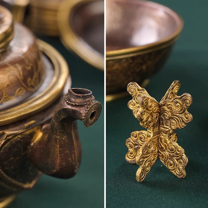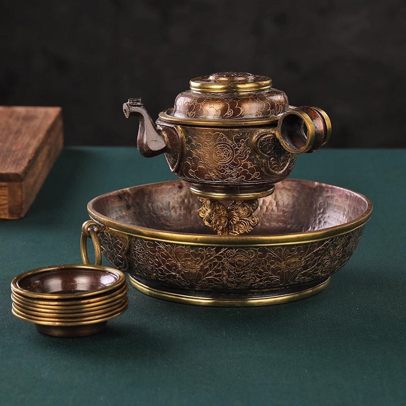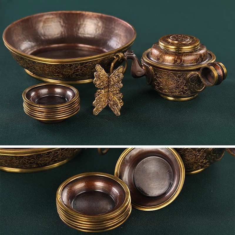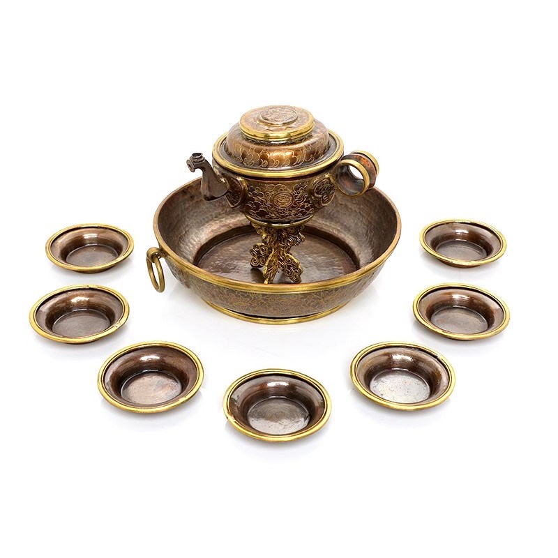 速发尼泊尔紫铜镀佛雕花水陆供盘水供水碗七财神修法供水杯供金具