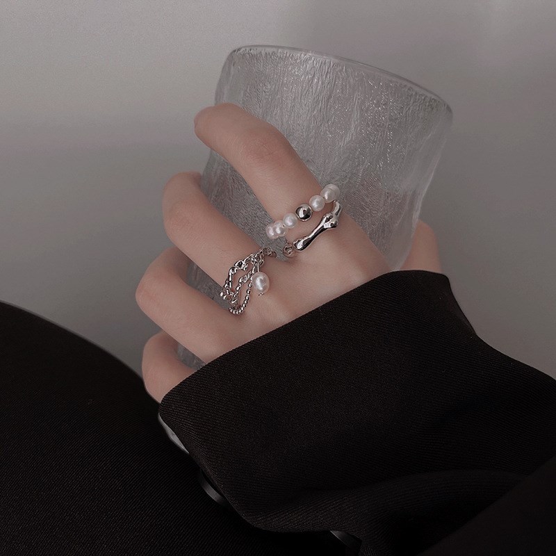 简约冷淡风复古时尚珍珠链条流苏不规则金属戒指女轻奢气质可调节