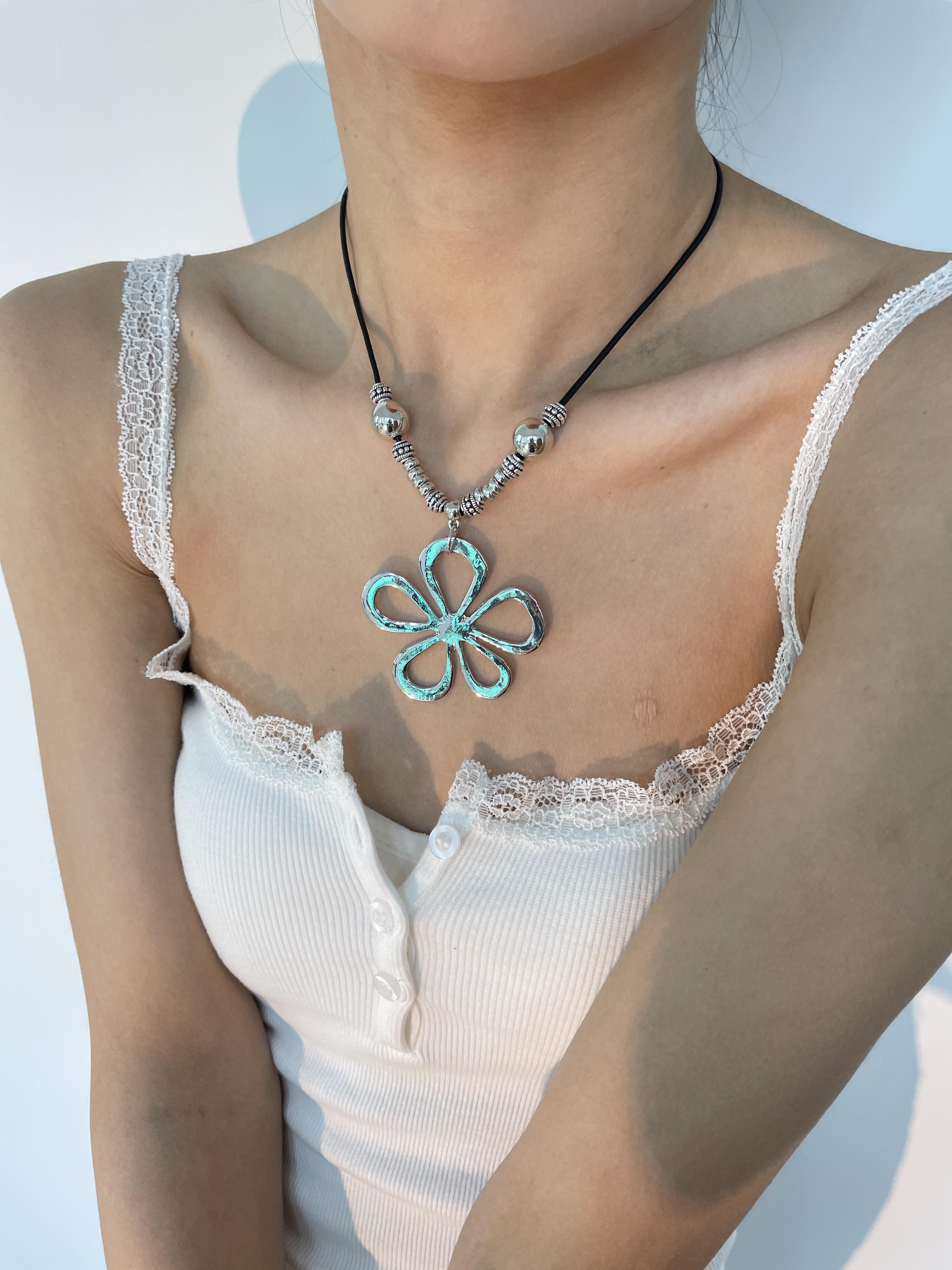 复古波西米亚个性金属花朵欧美风ins项链黑色皮绳甜酷民族风颈链