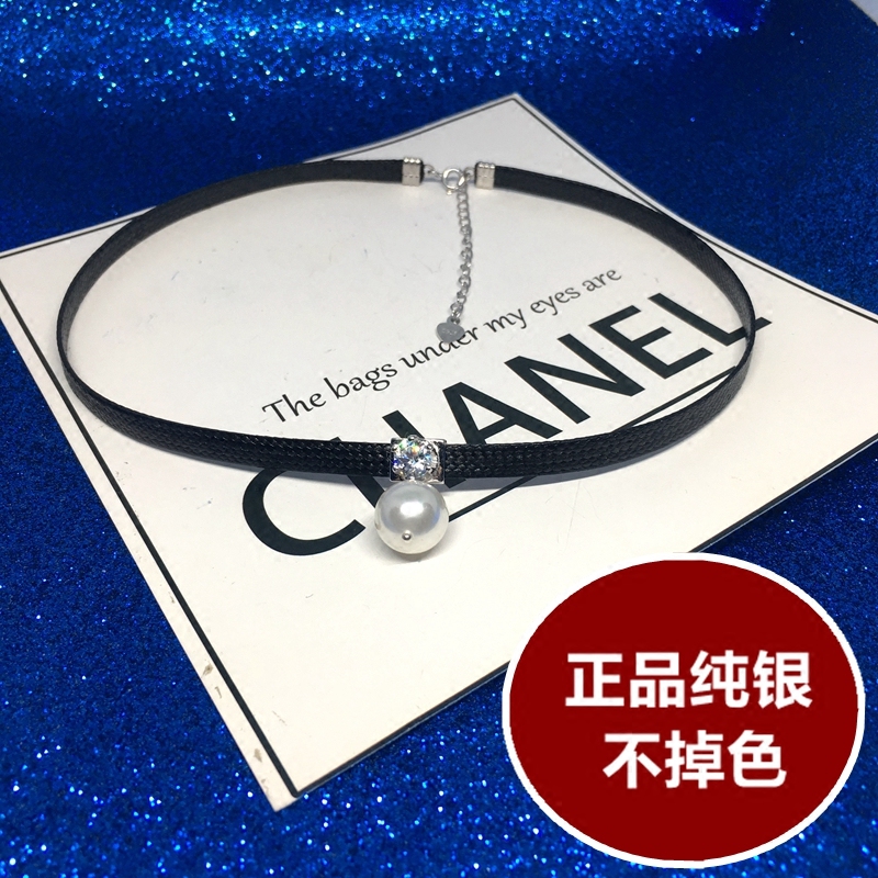 925纯银网红皮绳项链女珍珠choker项圈颈带脖链锁骨链短款简约韩