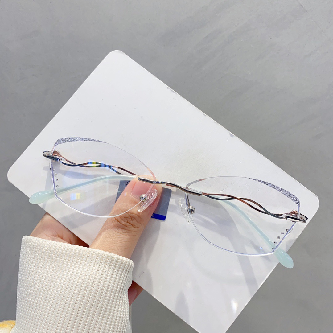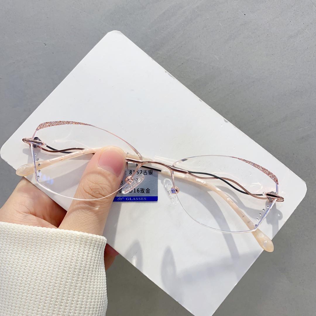 钻石切边无框眼镜近视女网上配镜小框镶亮粉防蓝光无边框超轻镜框