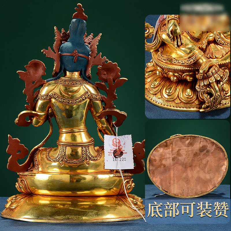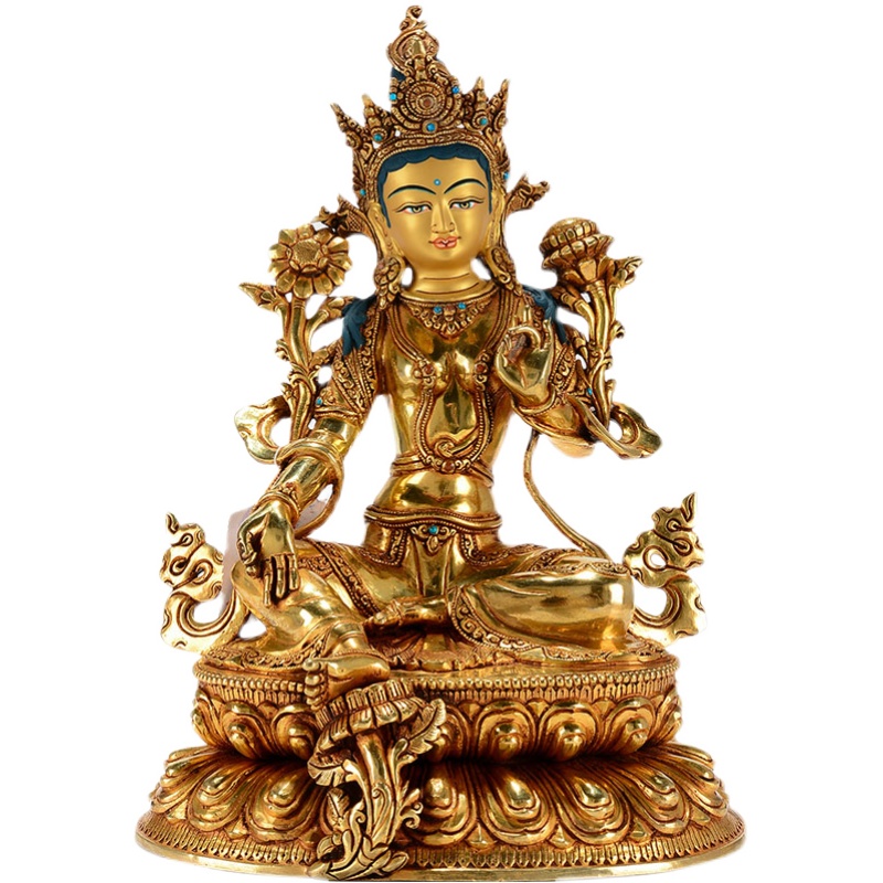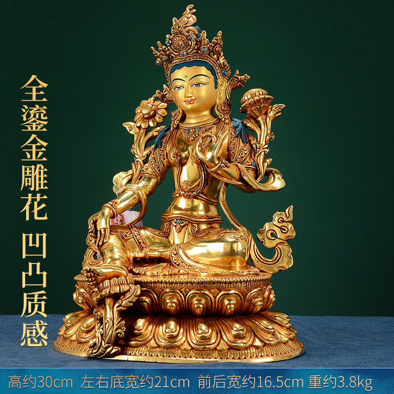 尼泊尔手工绿度母鎏金雕花铜像居家桌面宝石镶嵌度母像10寸