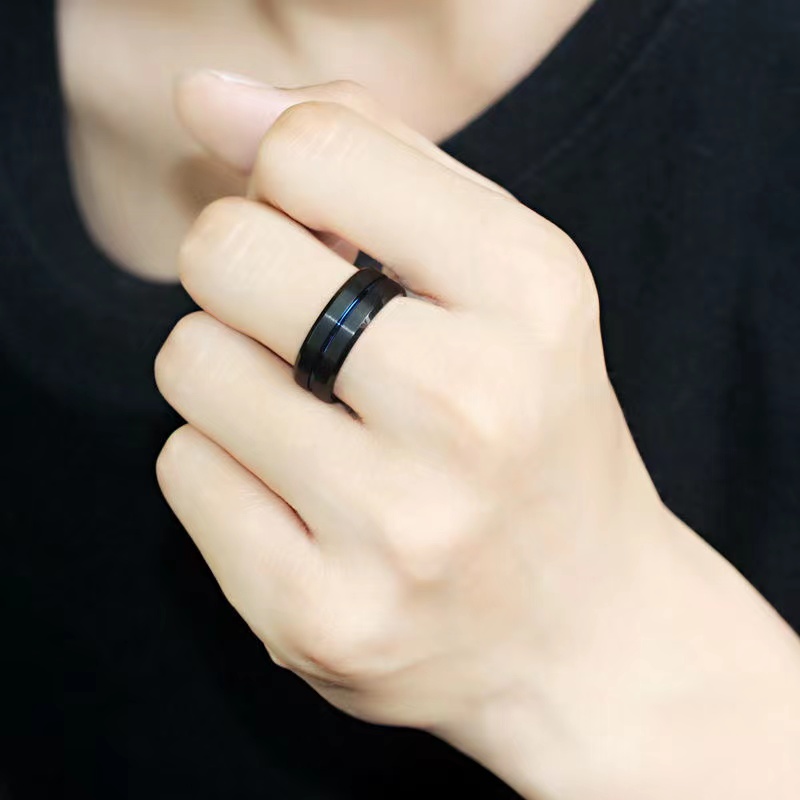 不锈钢黑色磨砂戒l指开槽内蓝男士时尚指环潮男单身戒个性食指戒
