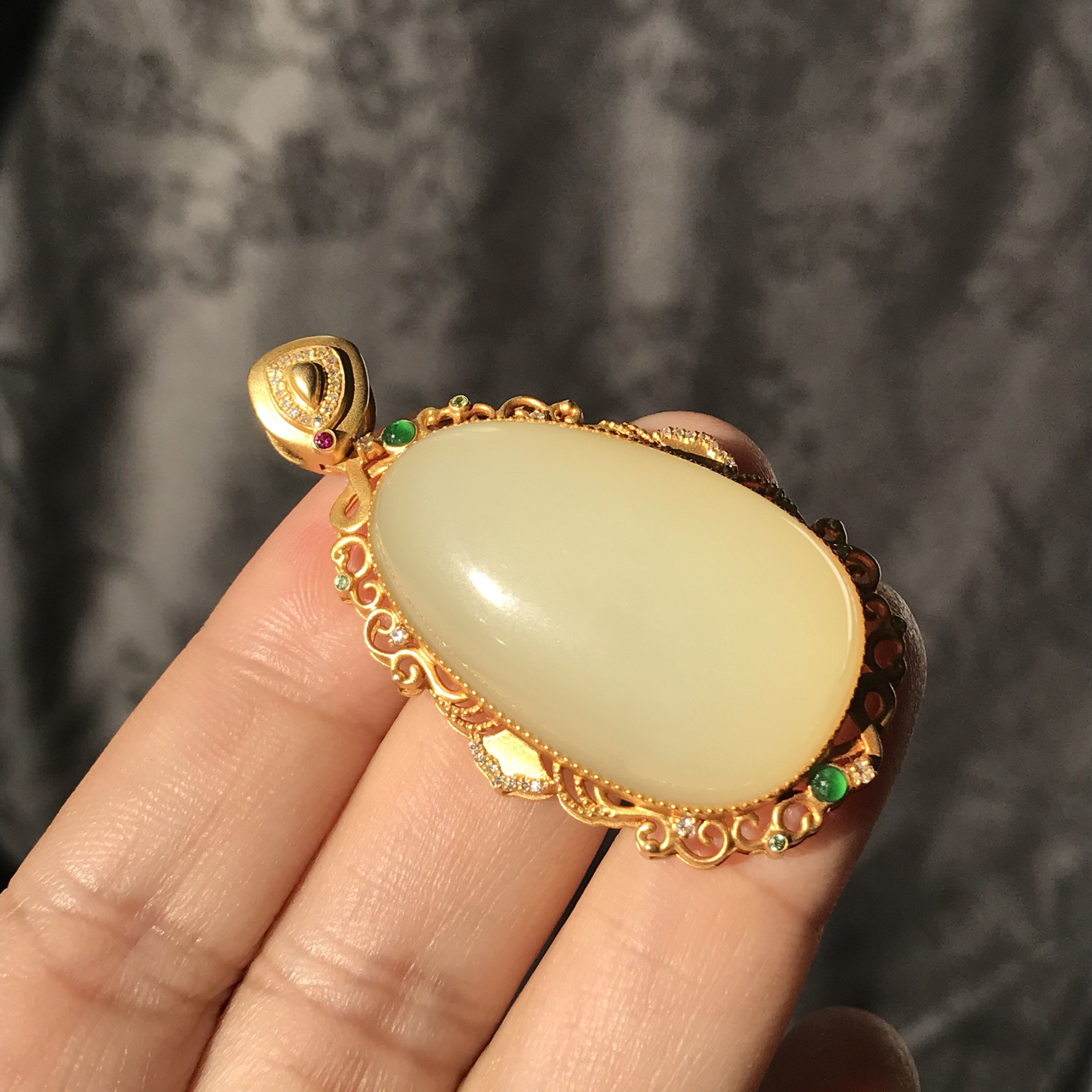 儒贤玉道新疆和田玉18K黄金镶嵌若羌黄口吊坠过肉眼过灯的料子