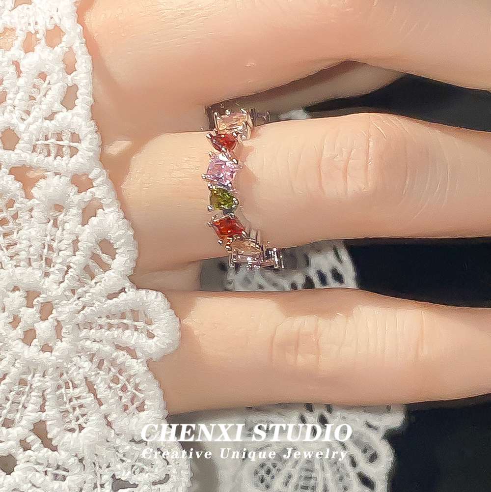 素圈轻奢锆石戒指女小众设计高级感彩色宝石开口食指戒气质指环