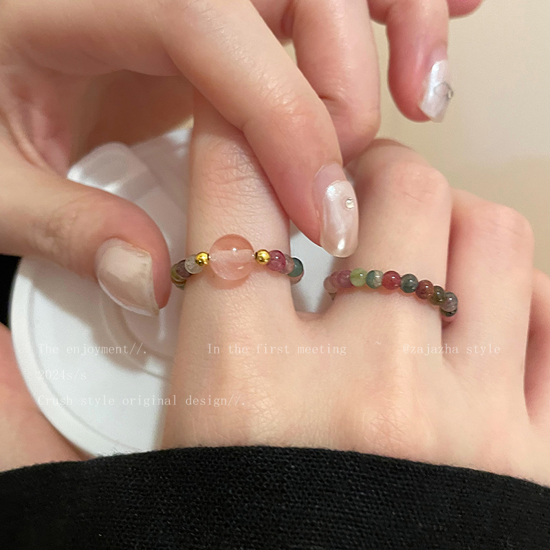 大圆珠碧玺串珠戒指女新中式复古弹力绳食指戒小众设计高级感指环