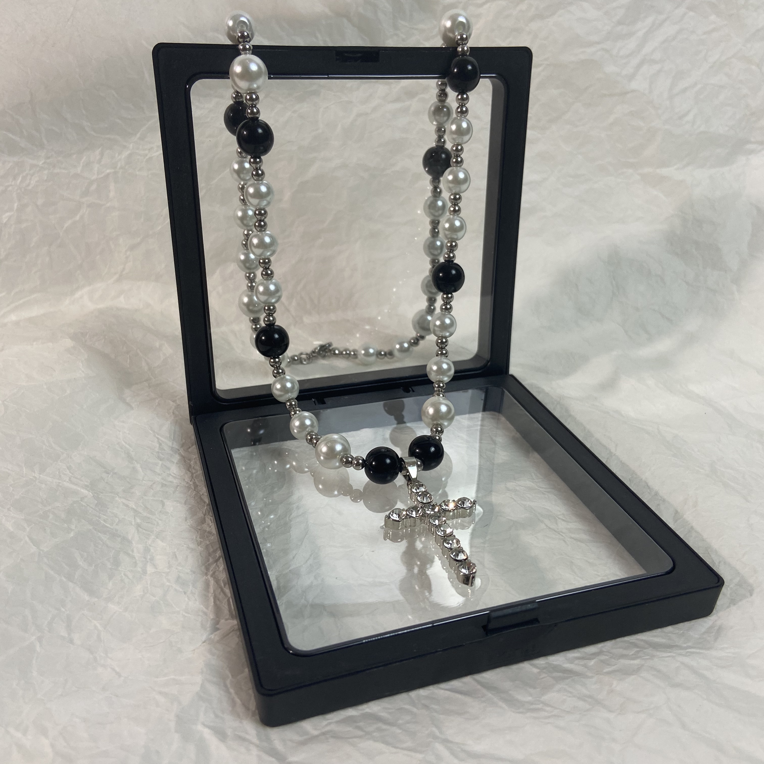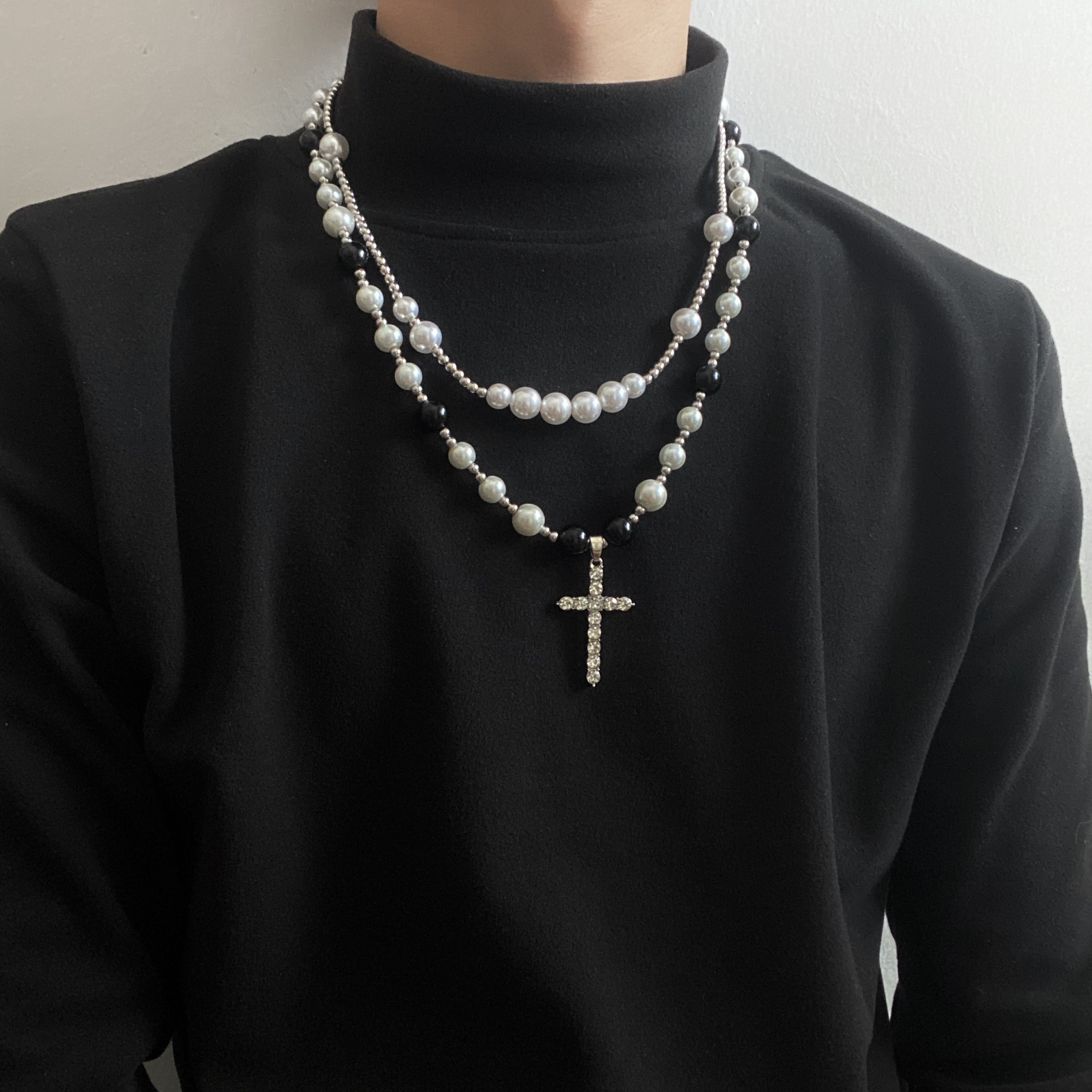 镶钻皓石十字架项链男女ins嘻哈复古珍珠双层叠戴个性中性风饰品