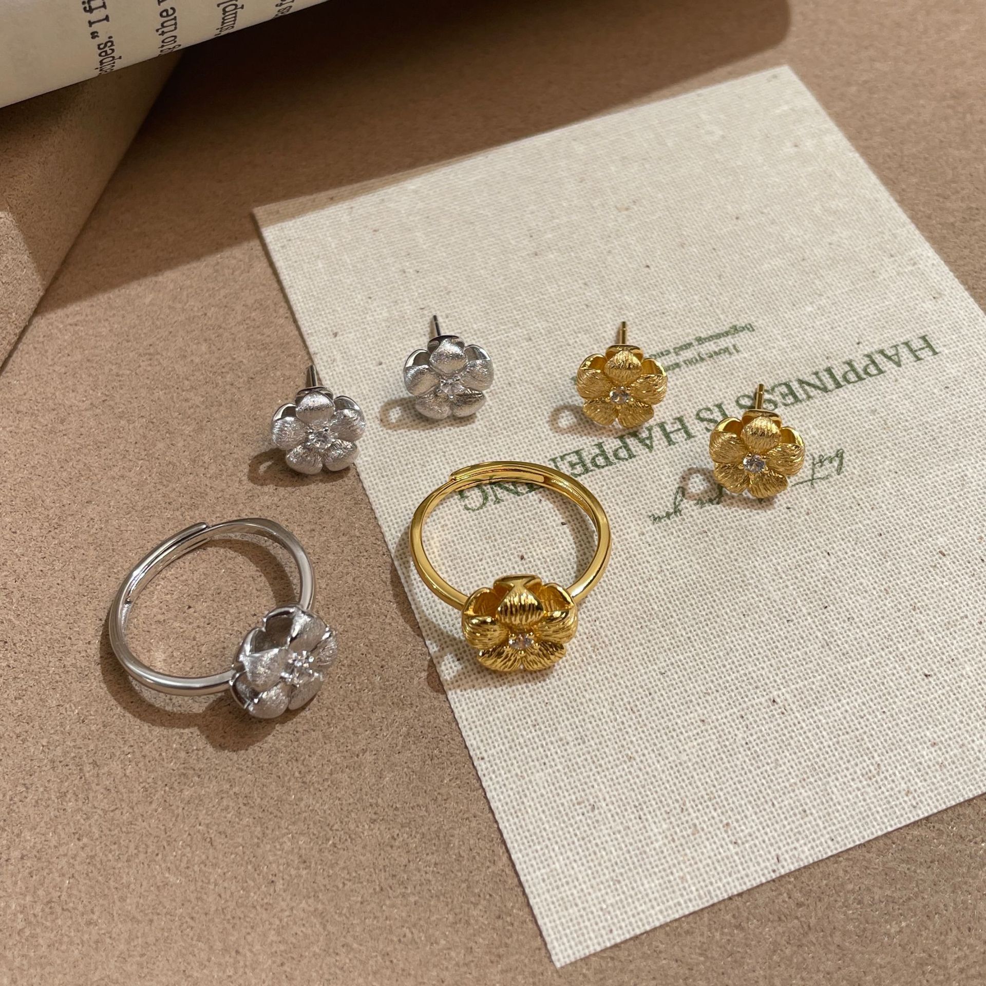蒂奇S925纯银立体梅花戒指女复古轻奢拉丝花朵点钻开口食指戒指