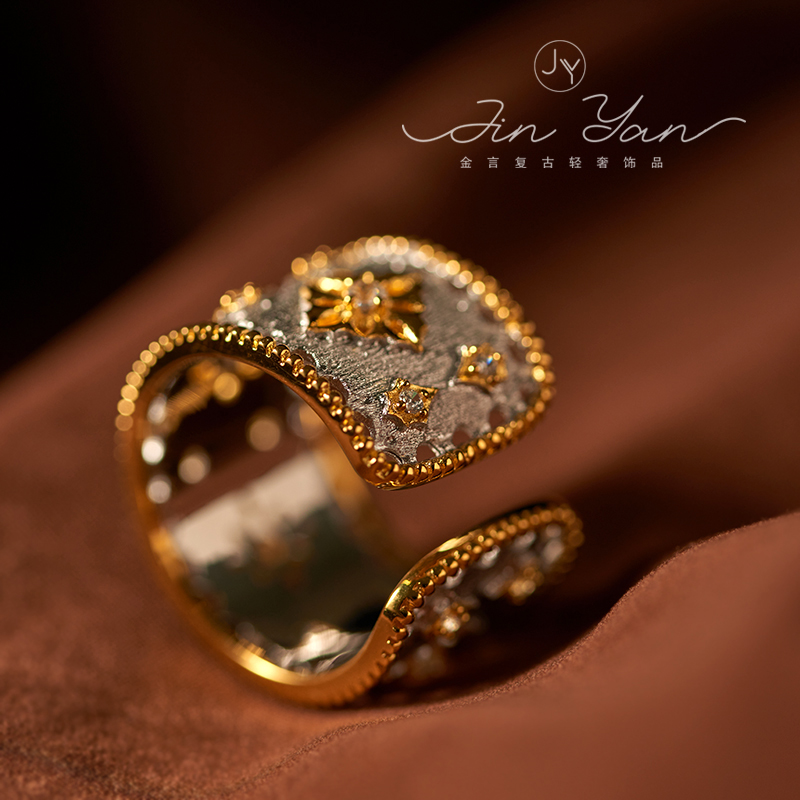 欧美复古意大利精工拉丝工艺s925纯银镀K金宫廷奢华镶锆开口戒指