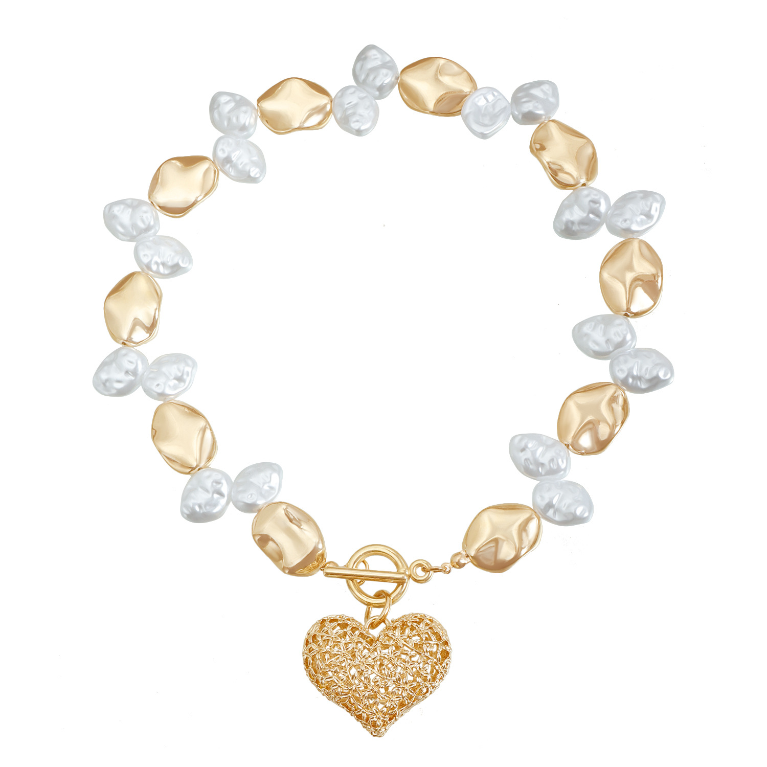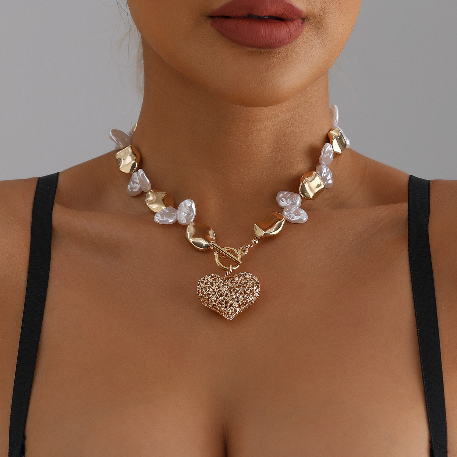 欧美跨境饰品INS拼接复古风异型珍珠金属感锁骨链镂空爱心项链女