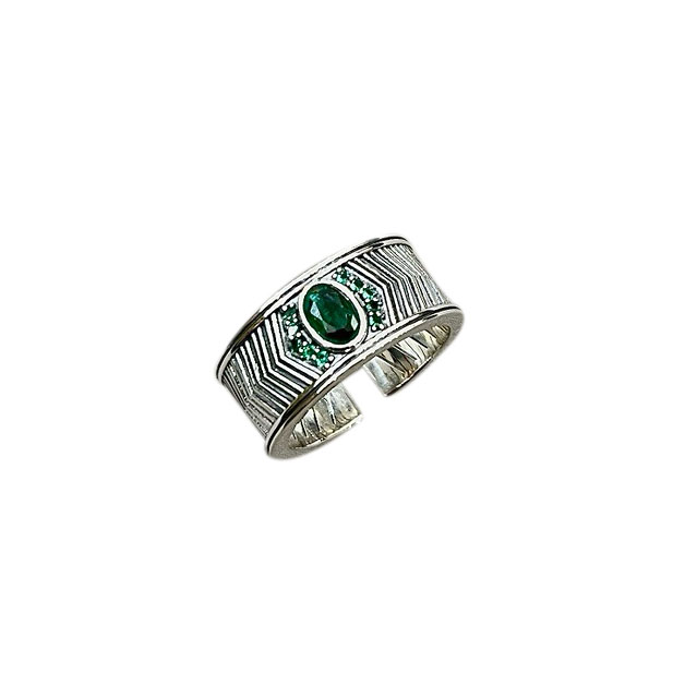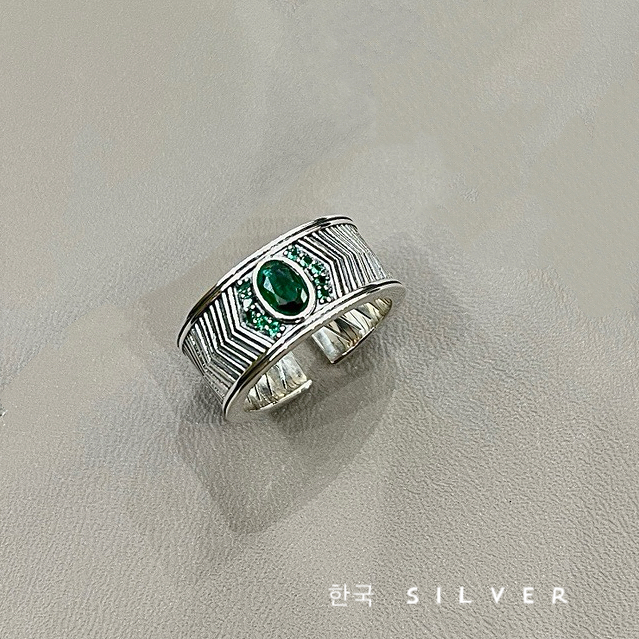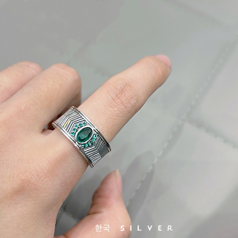 韩代重工S925纯银戒指宽版复古波纹祖母绿镶钻可调节百搭食指戒潮