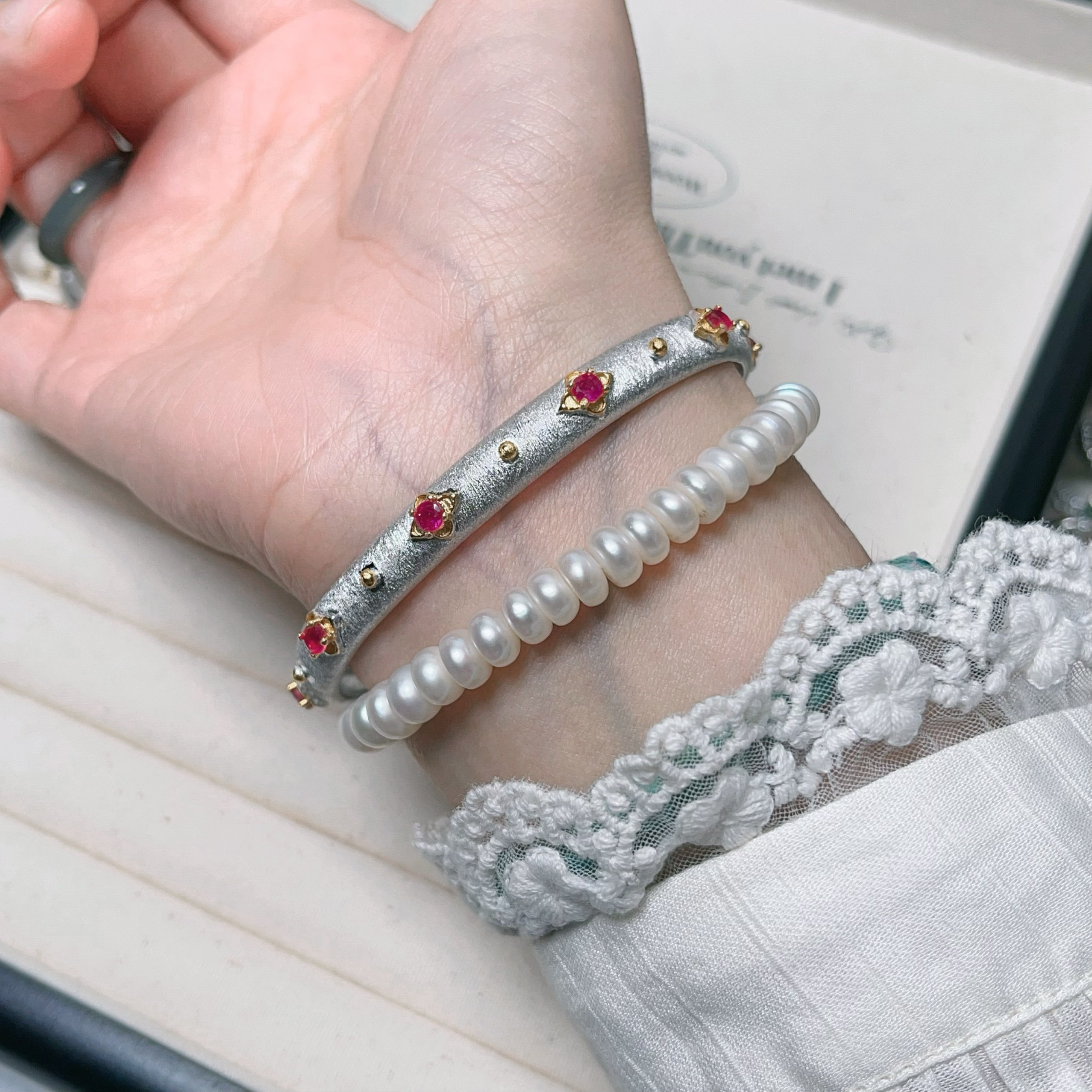 s925纯银新款布契拉缇风拉丝纯银手镯红宝石透辉石开口手环高级感