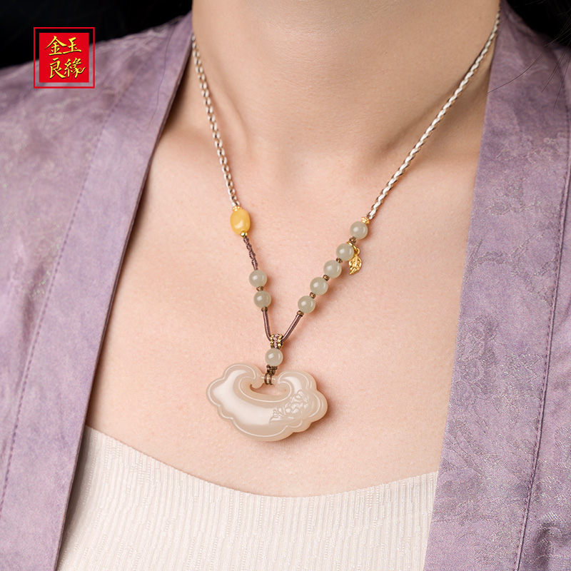 金玉良缘【步步生莲】藕粉和田玉莲花如意锁吊坠项链平安锁
