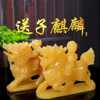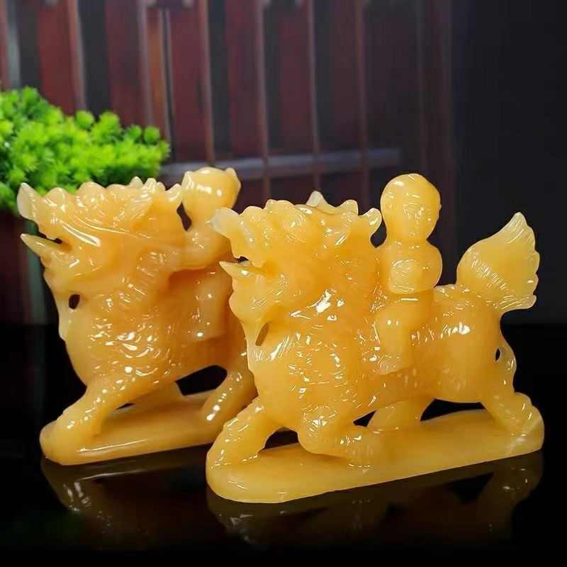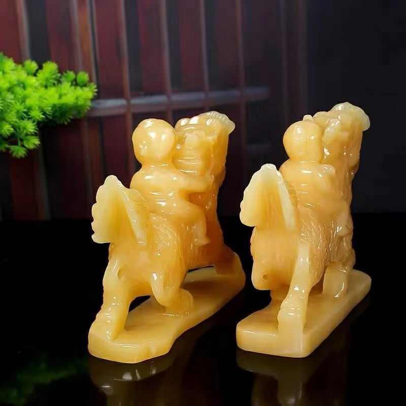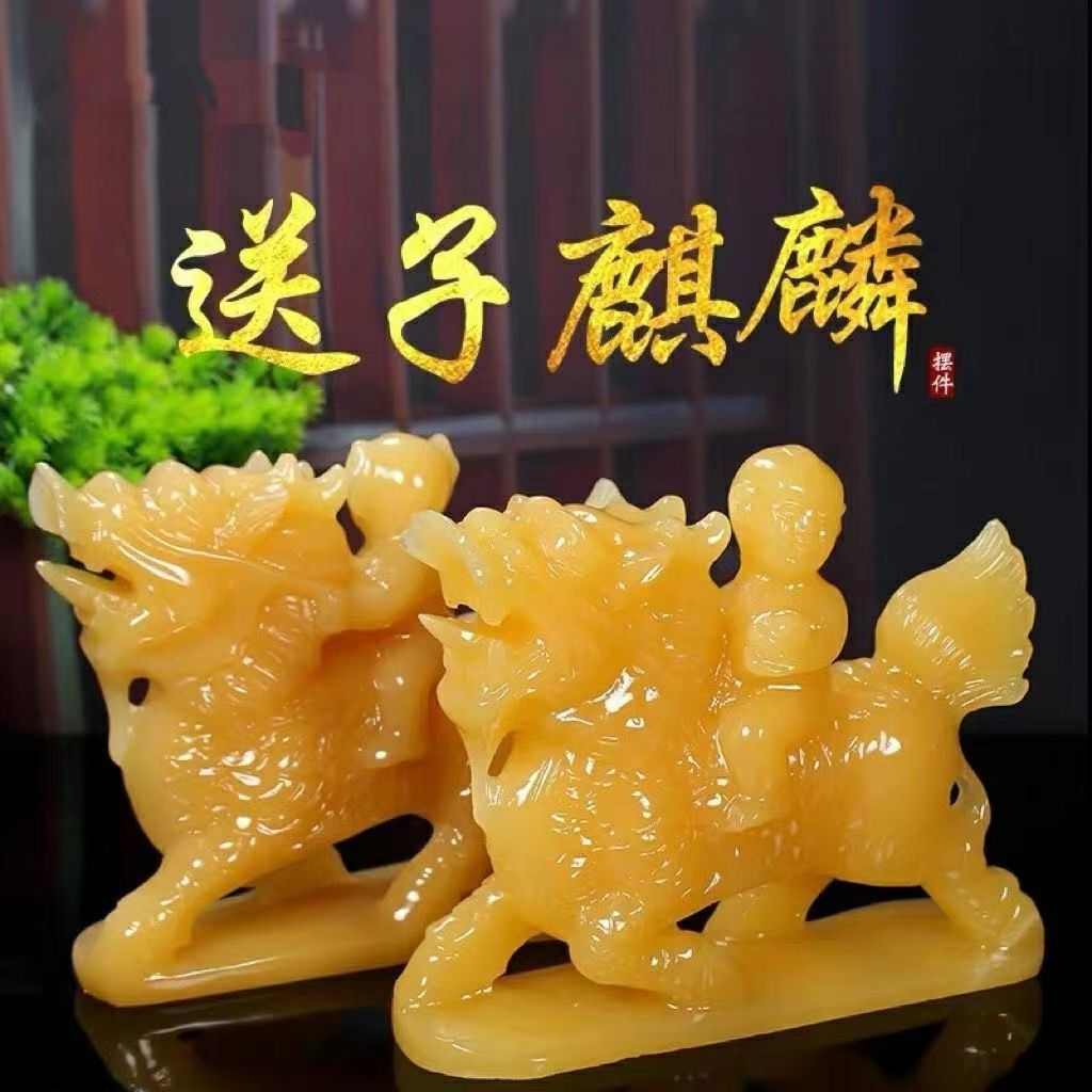 天然米黄玉送子麒麟摆件吉祥玉麒麟客厅卧室室内金童玉女工艺品