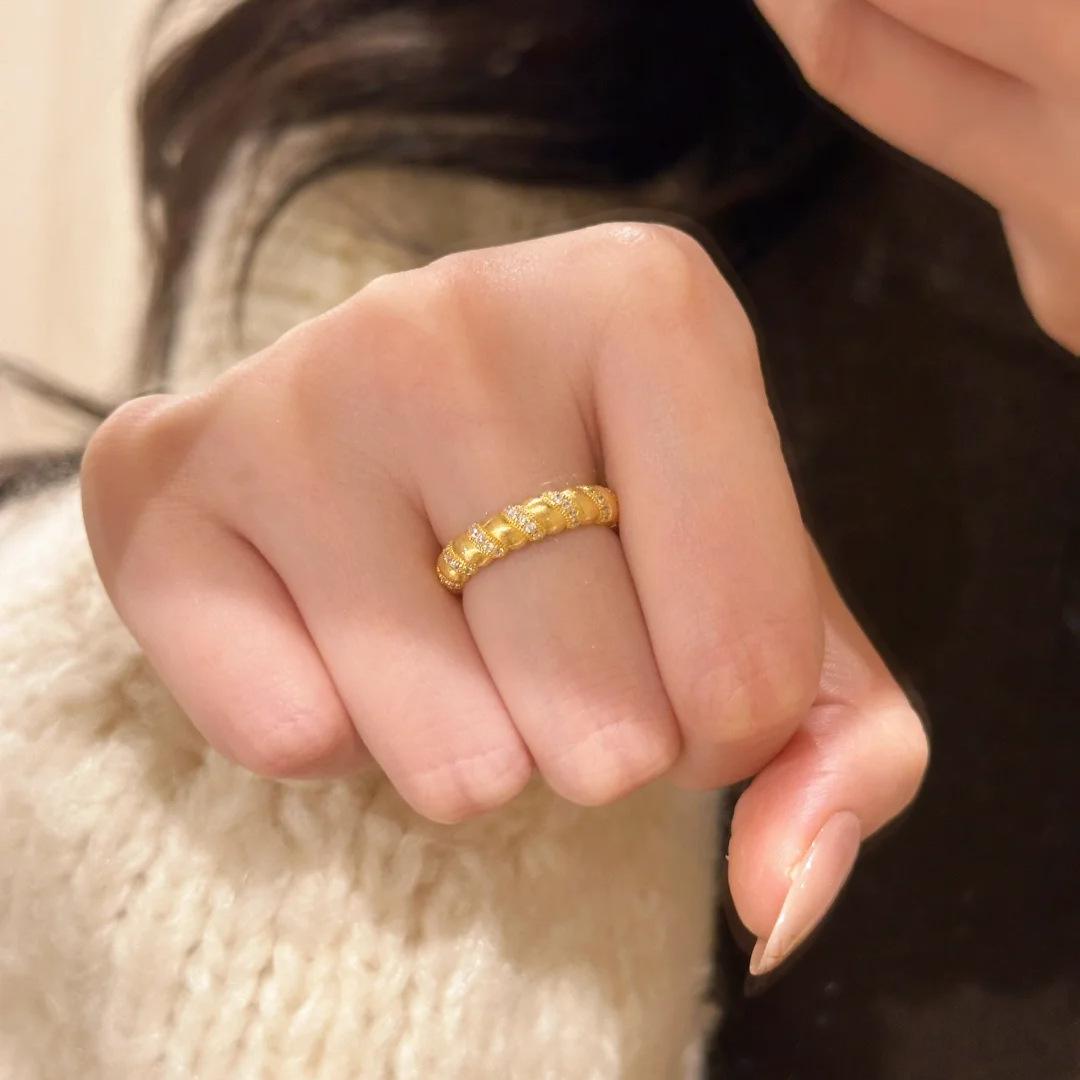 Vintage中古风蕾丝拉丝缠绕戒指意大利复古镶钻窄版排戒条戒尾戒