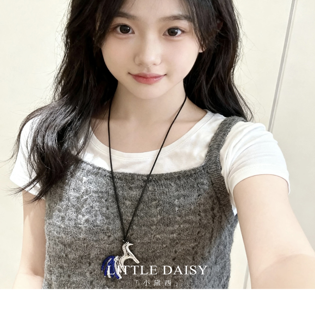 「小黛西」高级感银色小马吊坠项链韩蓝色串珠流苏挂脖长款毛衣链