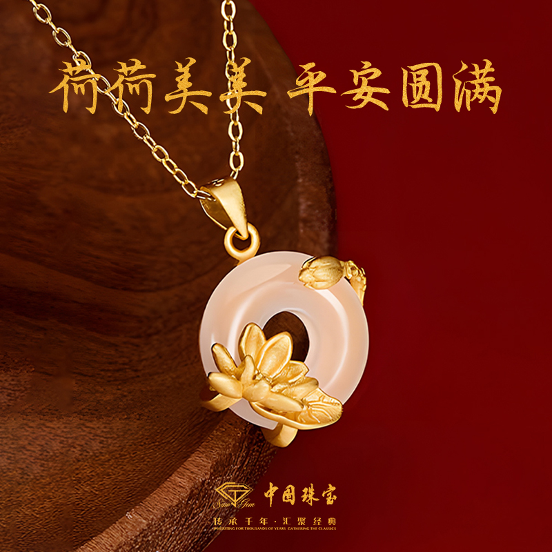 中国珠宝925银荷花平安扣项链女款轻奢和田玉吊坠生日礼物送妈妈