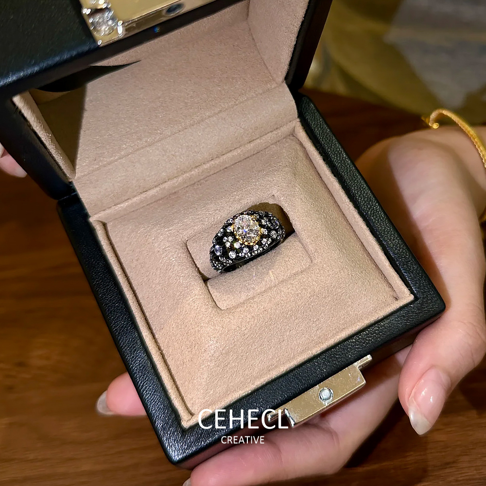 高级感轻奢黑色椭圆闪钻戒指女2025新款爆款小众设计中古宽面指环