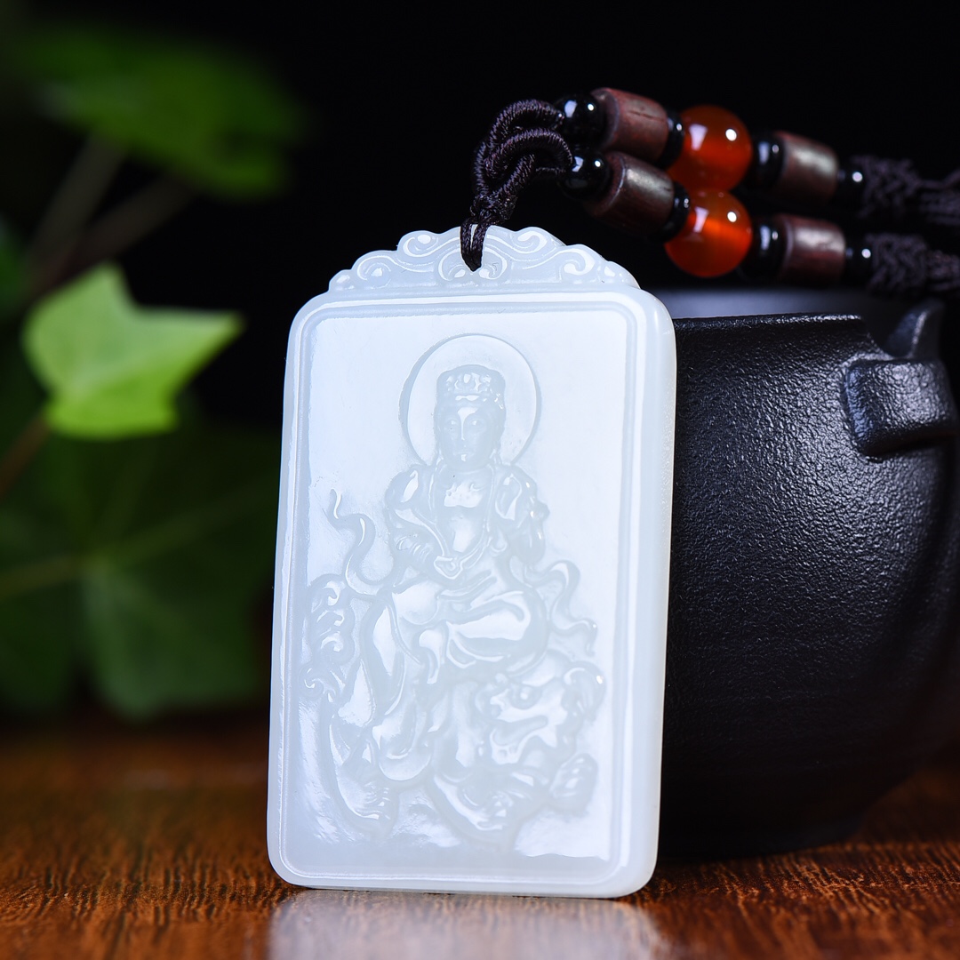 新疆和田玉羊脂玉白玉青白玉骑兽观音平安牌吊坠男女挂件玉坠玉佩